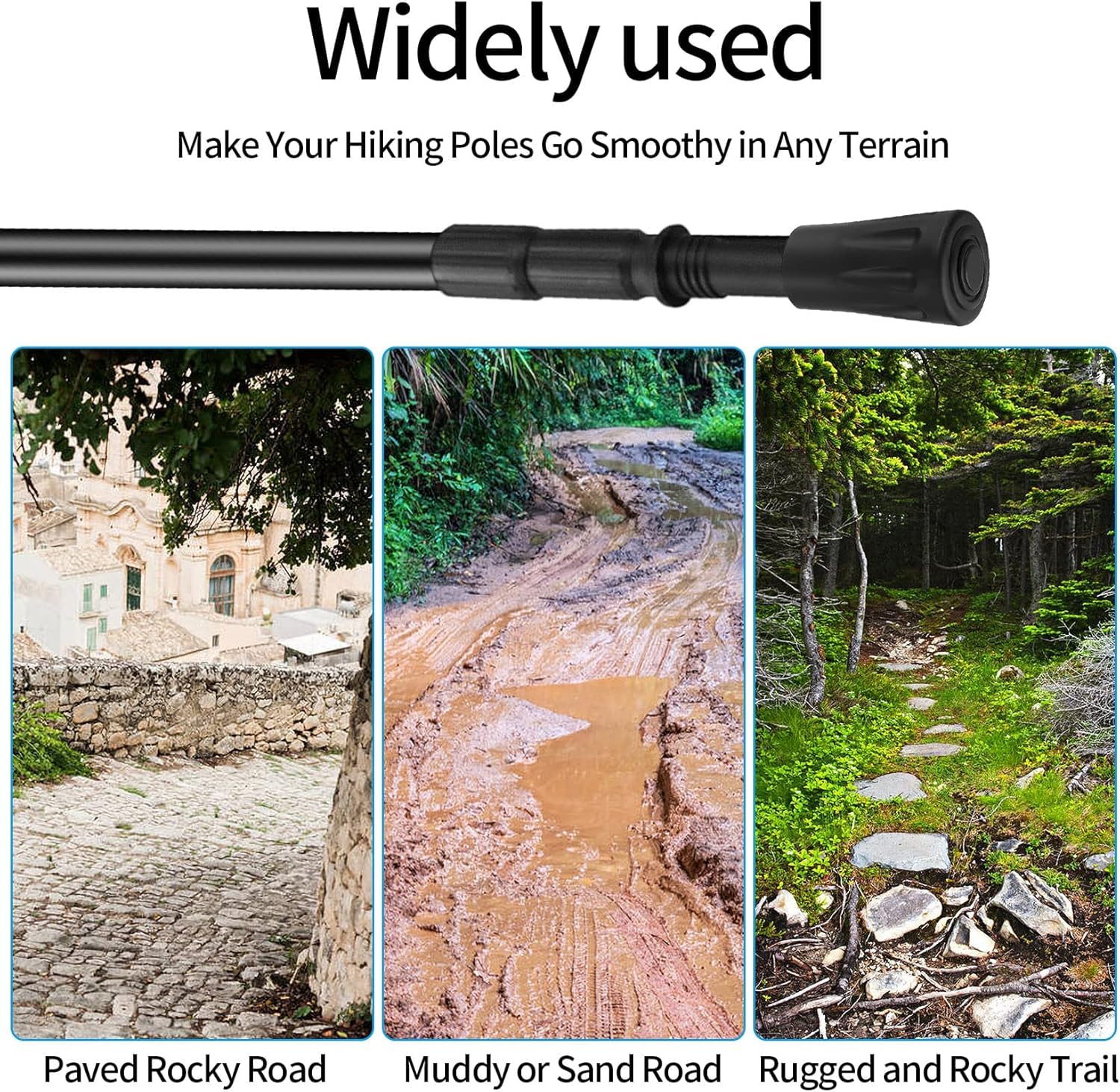 - Plašs pielietojumu klāsts: piemērots sportam, pārgājieniem, trekingam, ceļošanai, alpīnismam, kempingam un citām aktivitātēm brīvā dabā. Piemērots lielākajai daļai trekinga nūju un nūjošanas nūju. Piemērots cementa ceļiem, asfalta ceļiem, mākslīgo ķieģeļu ceļiem, akmens ceļiem utt.