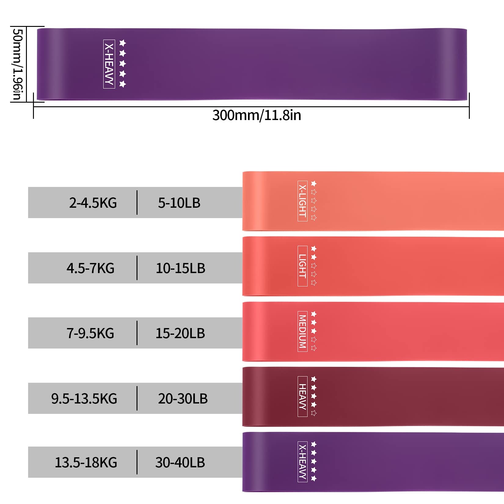 - 5 pretestības līmeņi: 5 krāsas attēlo 5 dažādus pretestības līmeņus: īpaši viegls, viegls, vidējs, smags un īpaši smags. Uz jogas stiepšanās lentēm ir skaidri norādīts arī pretestības līmenis, ko ir viegli atšķirt, un jūs varat izvēlēties sev piemērotāko intensitāti atbilstoši savām vajadzībām.