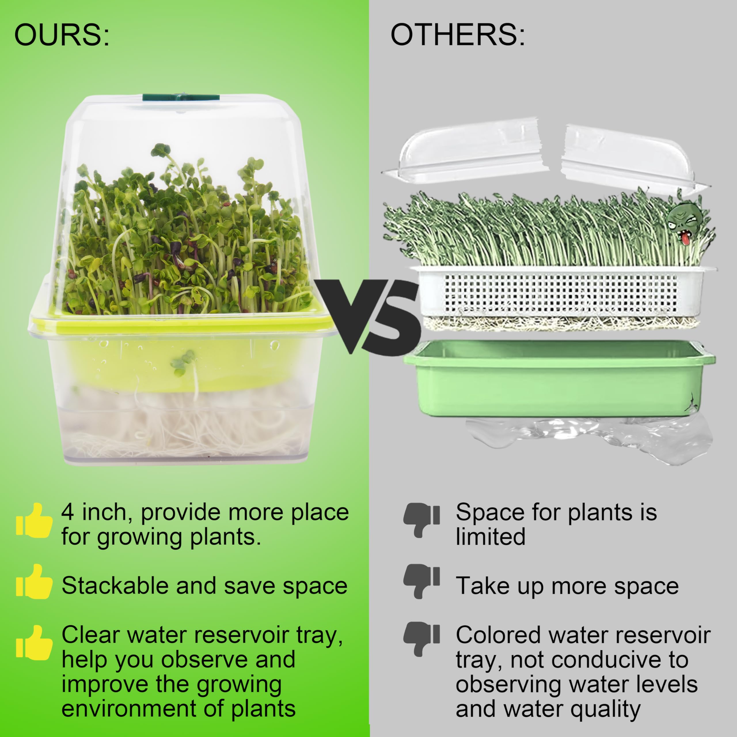 - [BPA nesaturošs materiāls]: Izgatavots no pārtikas kvalitātes PP (polipropilēna) materiāla, dīgšanas paplāte ir bez BPA, droša, netoksiska, bez smaržas un izturīga. Sēklas ir viegli diedzēt bez augsnes vai ķīmiskām piedevām, kas sniedz fantastisku dīgšanas pieredzi. Jūs varat baudīt veselīgus, barojošus asnus salātiem, sviestmaizēm un zupām mājās.