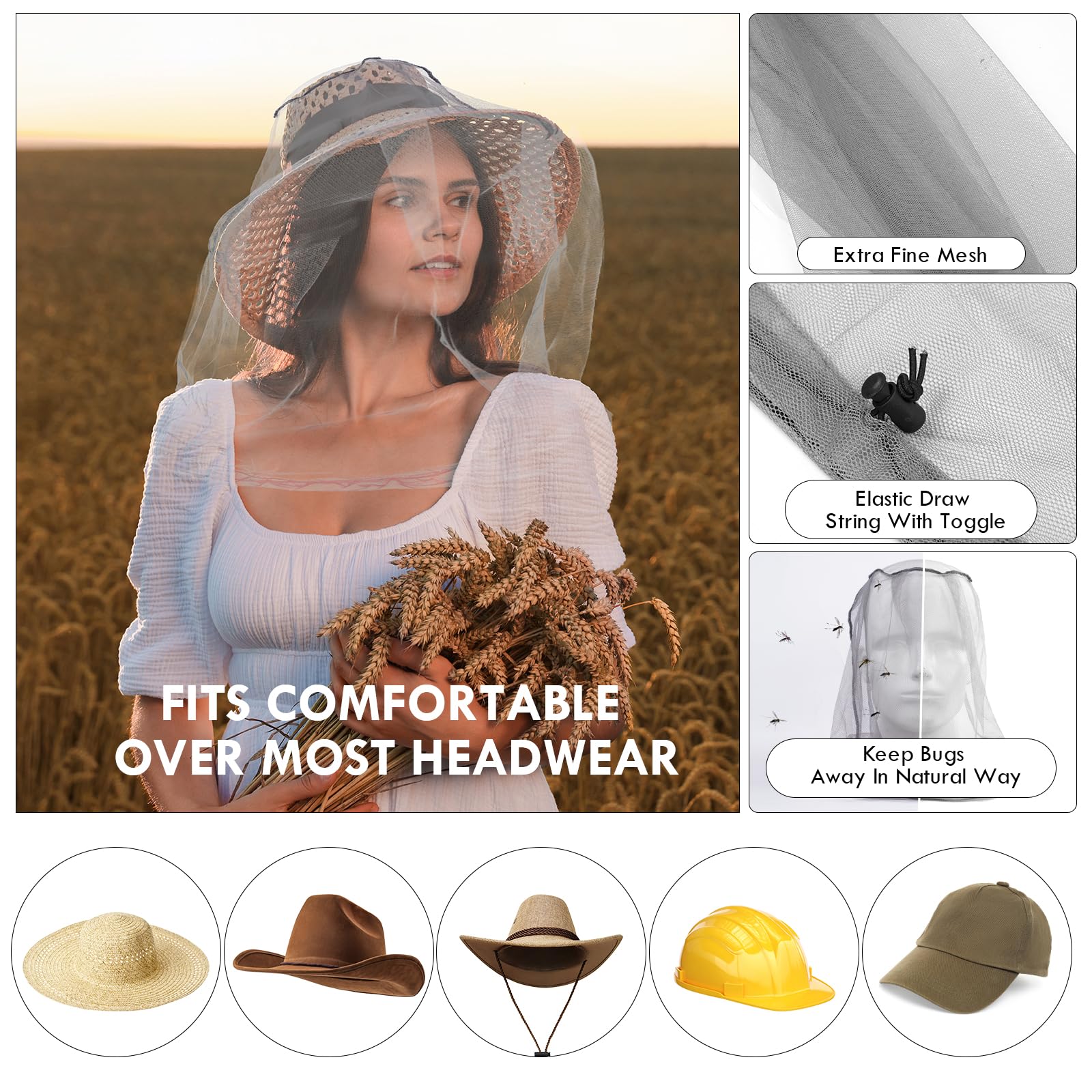 - 【Praktisks materiāls】Kukaiņu aizsardzības galvas tīkls Izgatavots no augstas kvalitātes moskītu tīkla auduma, elpojošs, mīksts, viegli tīrāms un atkārtoti lietojams. Apakšā ir elastīga lente, kas neļauj odiem un citiem kaitinošiem kukaiņiem kost seju un kaklu.