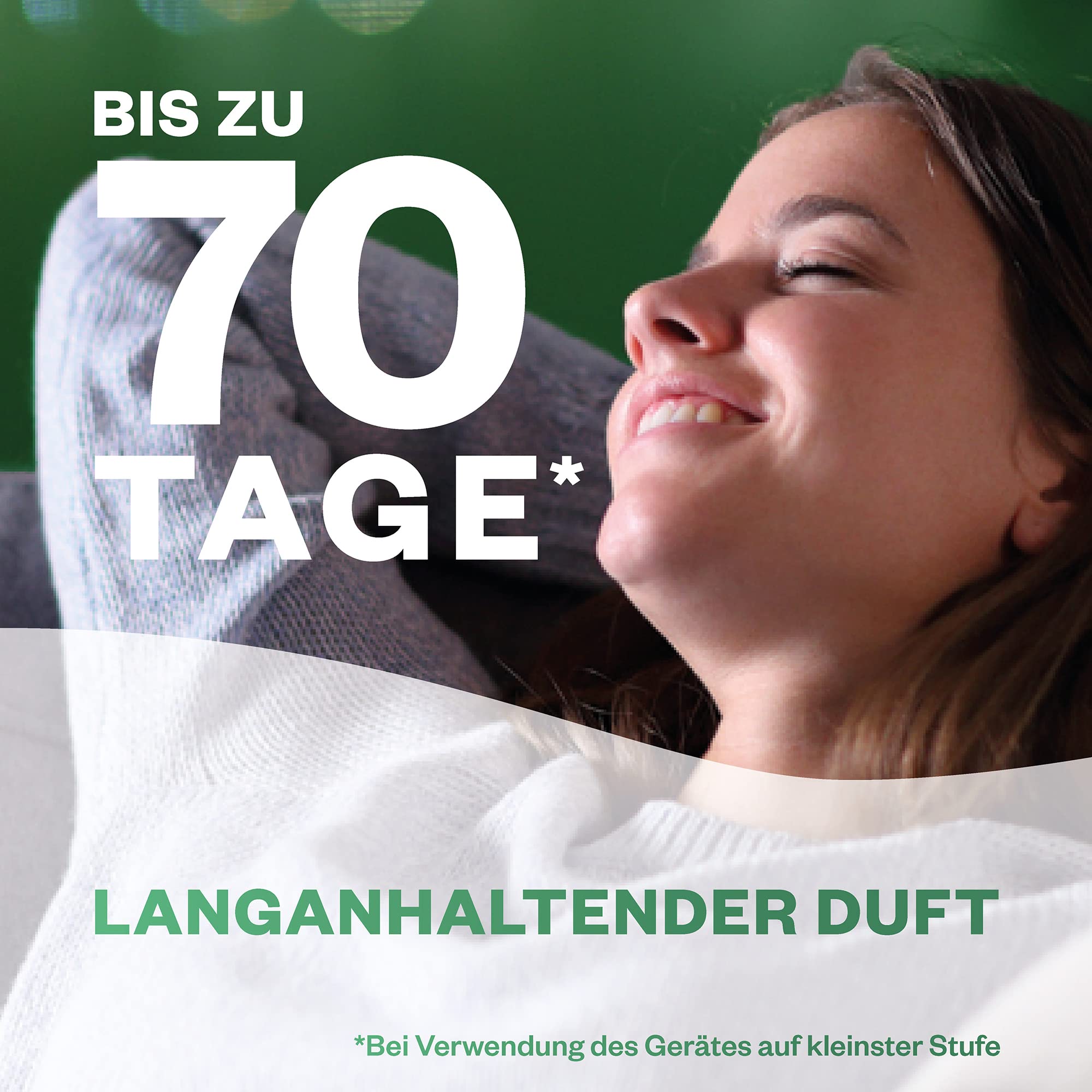 -  70 DIENU AROMĀTS: Viena uzpilde pietiek līdz 70 dienām (lietojot ierīci ar zemāko iestatījumu) / Aromāts tiek izdalīts trīs laika intervālos, kurus var iestatīt pats vai vienkārši nospiežot tūlītējās iedarbības pogu