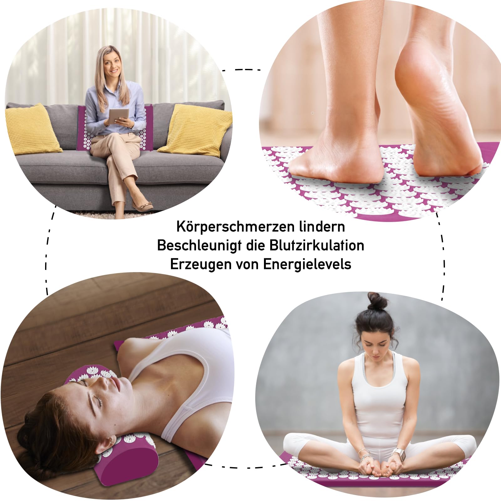- 【Akupunktūras masāža, muskuļu relaksācija】 Akupresūras paklājiņa dizains ir iedvesmots no akupunktūras masāžas, ko tradicionālā ķīniešu medicīna (TCM) izgudroja pirms 3000 gadiem. Darbības princips ir aktivizēt noteiktus meridiānus, izmantojot spiedienu, lai palīdzētu mūsu ķermenim izdalīt sāpes remdējošus endorfīnus. Tas var efektīvi mazināt stresu, uzlabot miegu, atslābināt muskuļus un mazināt sāpes utt.