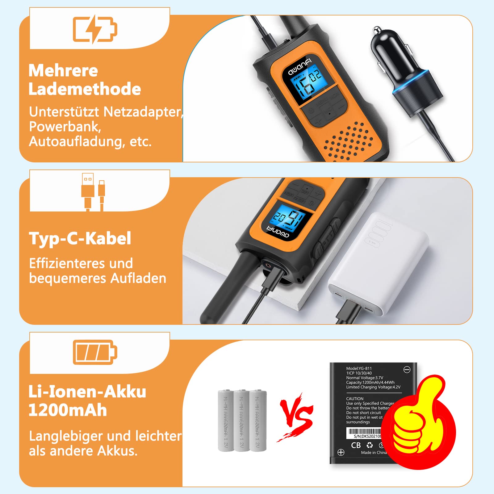 - Savietojams ar jebkuru rāciju: AWANFI uzlādējamajām rācijām ir 16 kanāli un 121 privātuma kods, no kuriem izvēlēties, lai nodrošinātu drošu zvanu. Iestatot vienādus kanālus un privātuma kodus, varat runāt ar citām PMR 446 rācijām neatkarīgi no to zīmola. Lielisks saziņas rīks, lai uzturētu kontaktus braukšanas, pārgājienu, kempinga un piedzīvojumu laikā.