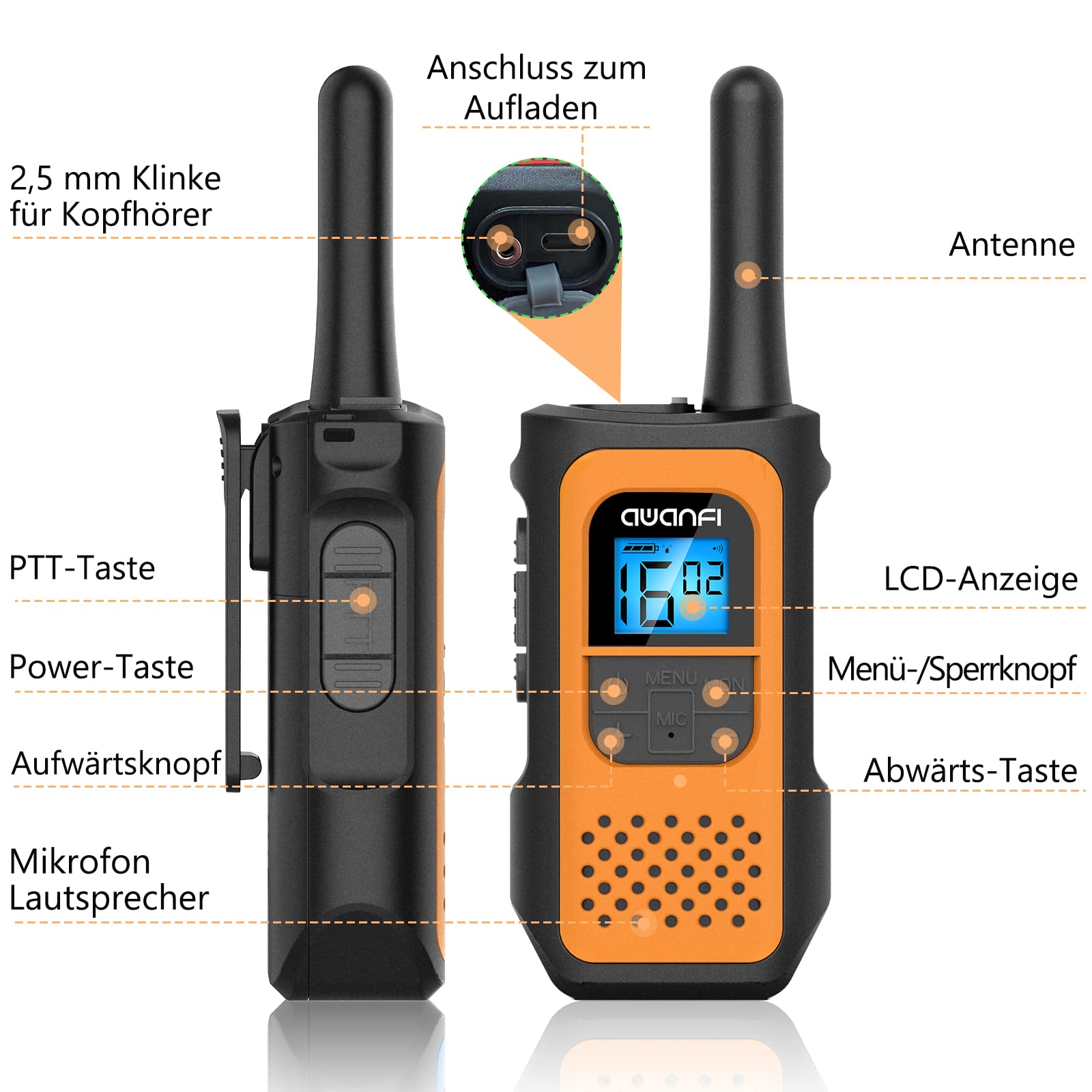 - Rācijas lielos attālumos: AWANFI rācijas pieaugušajiem ir aprīkotas ar uzlabotu mikroshēmojumu, kas nodrošina skaidru audio pārraidi lielos attālumos. Ar attālumu līdz 2 km starp kaimiņiem varat patīkami sarunāties ar draugiem un ģimeni. (Faktiskais diapazons var būt mazāks, salīdzinot ar maksimālo diapazonu; slikti laikapstākļi, ēkas un automašīnas ietekmē diapazonu.)