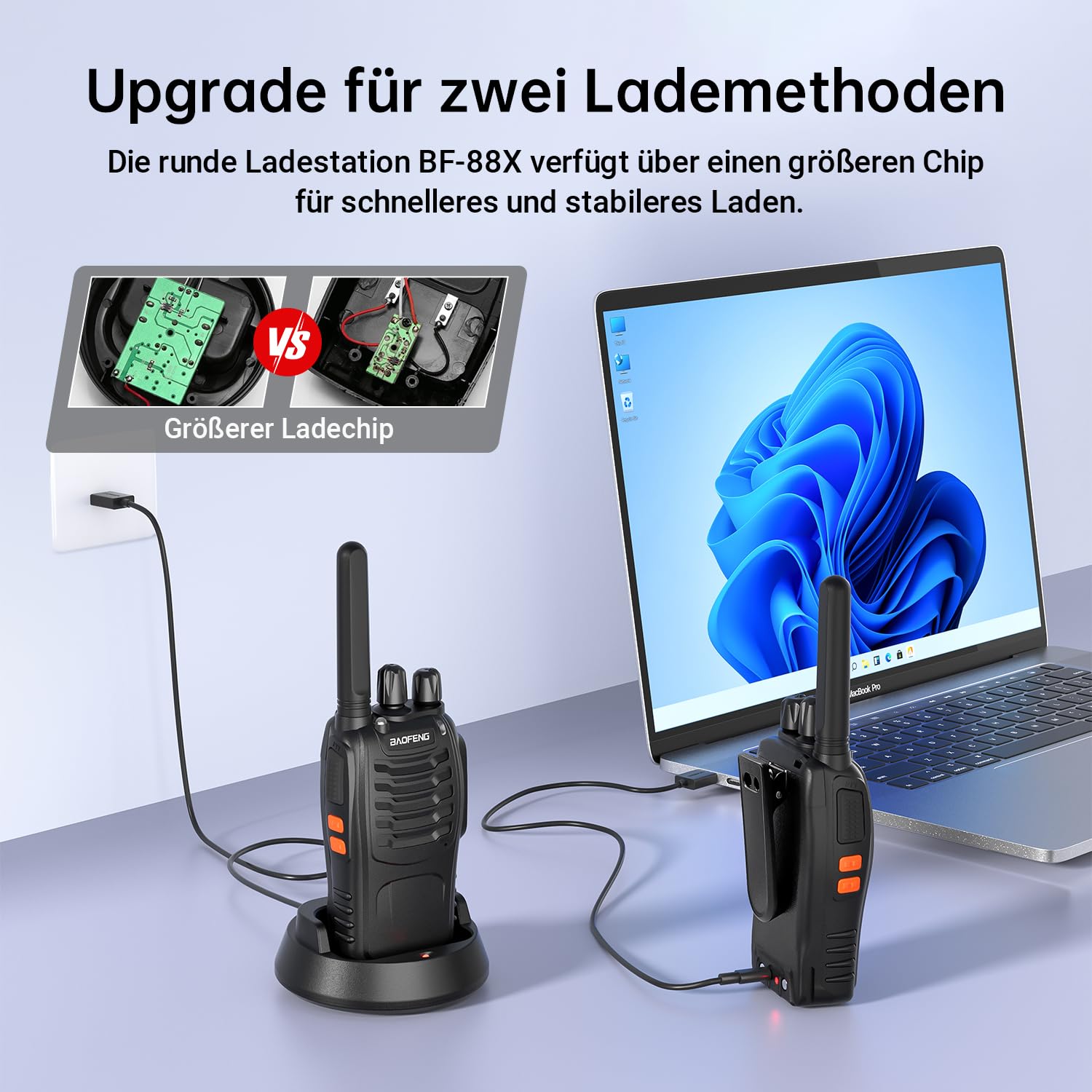 - 【1500 mAh litija jonu akumulators】 Šīs uzlādējamās rācijas darbojas aptuveni 8–12 stundas ar pilnu uzlādi, bet to uzlāde aizņem tikai 3–4 stundas. Divvirzienu radio akumulatoru var uzlādēt atsevišķi uzlādes stacijā vai arī uzstādīt uz rācijas un uzlādēt kopā, kas ir ļoti ērti. Kad radio akumulators ir gandrīz tukšs, automātiski atskan pīkstiens.