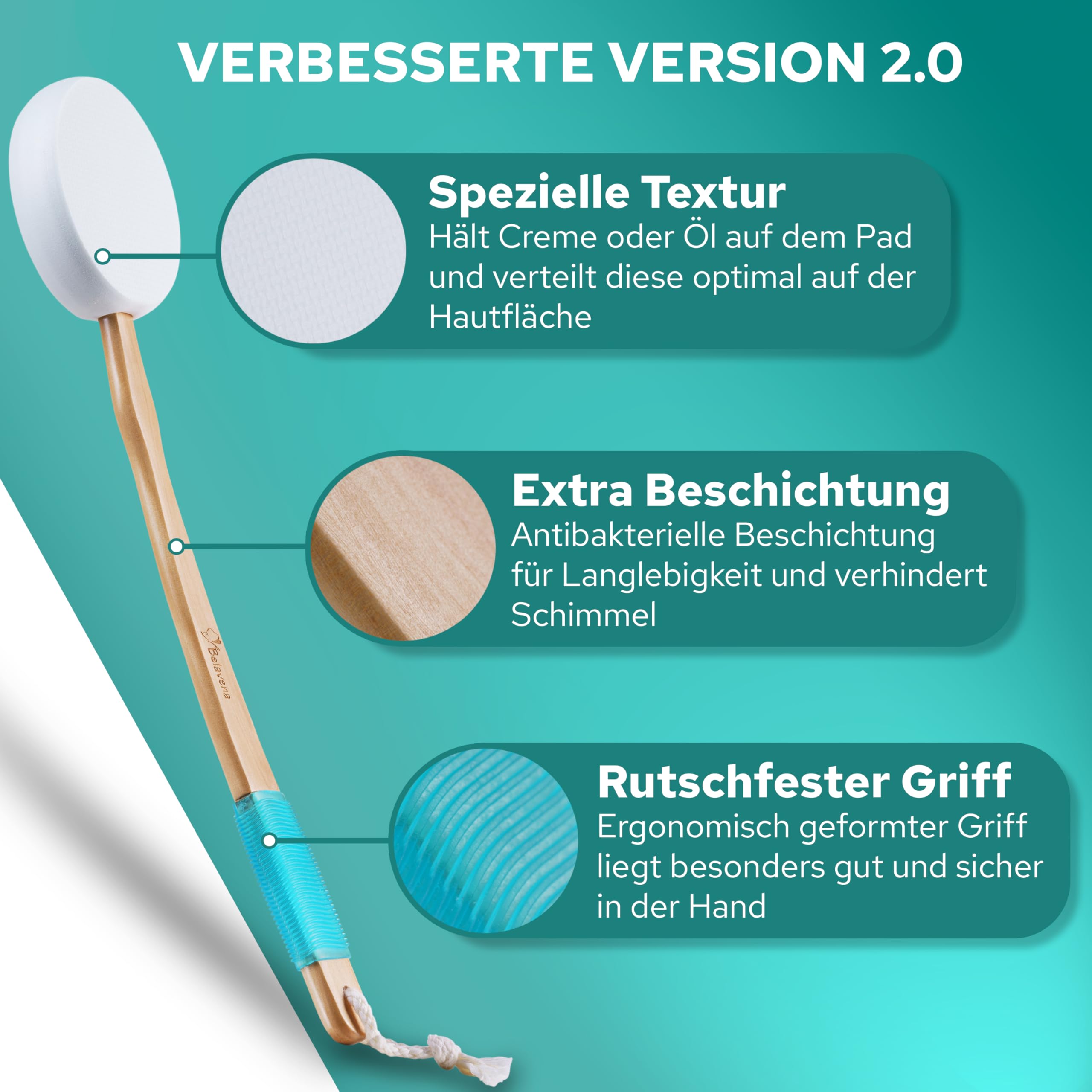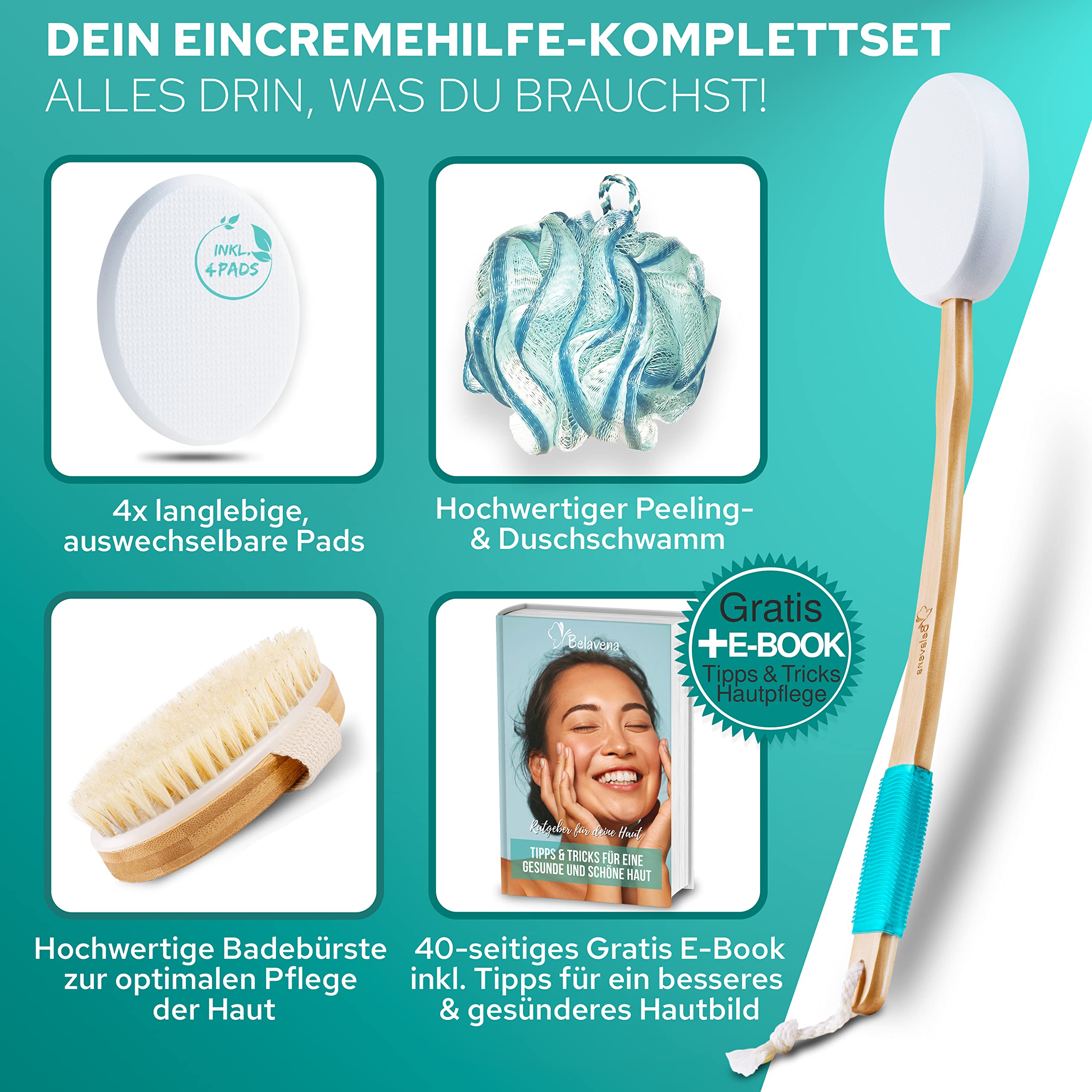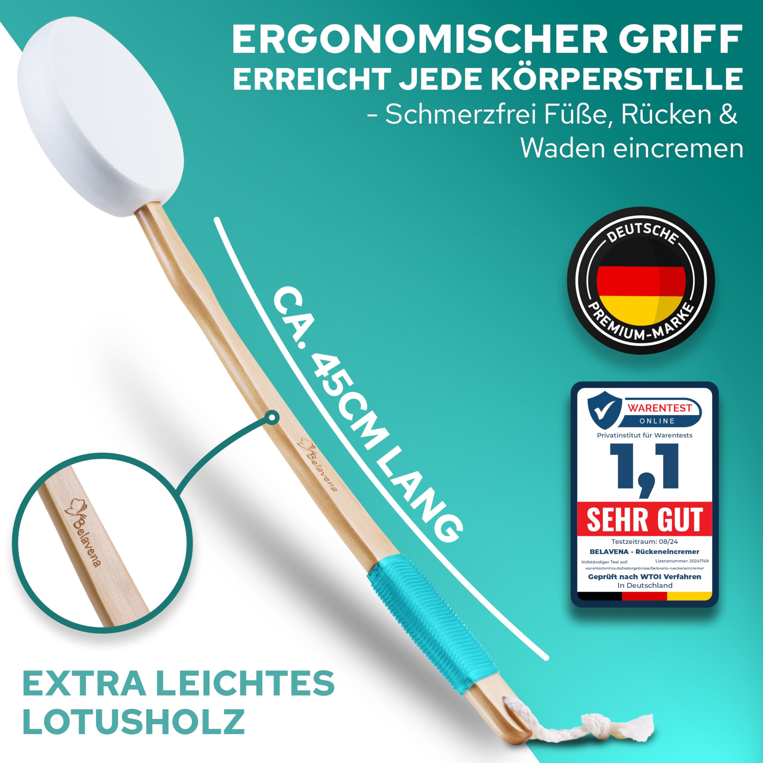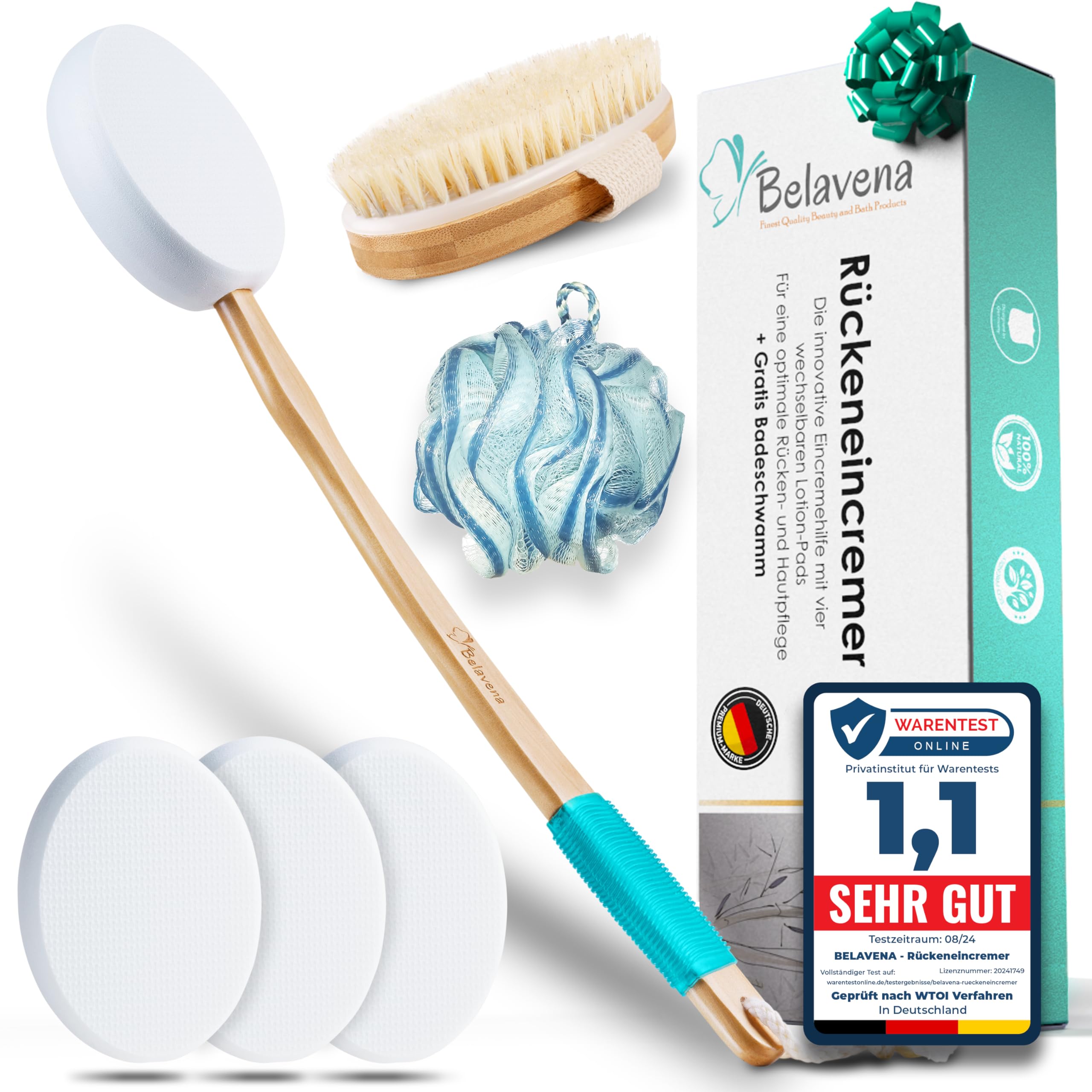 BELAVENA© muguras krēmveida līdzeklis | Uzlabota koncepcija 2025. gadam — optimāla muguras kopšana ar muguras krēmeri/muguras birsti, ieskaitot 4 nomaināmus spilventiņus — muguras krēmeris/muguras krēma līdzeklis