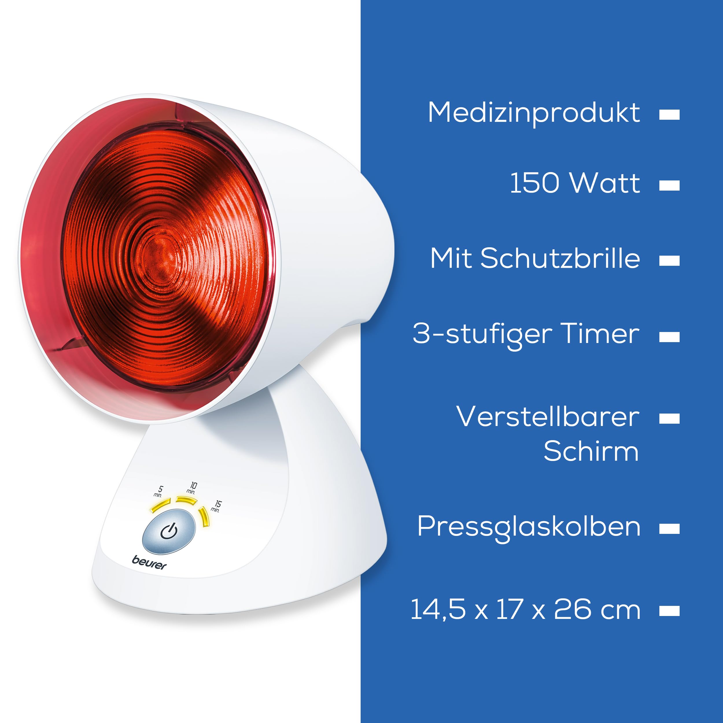 Sarkanās gaismas lampas svarīgākās funkcijas īsumā: 3 pakāpju elektroniskais taimeris ar LED displeju 5, 10 vai 15 minūšu apstrādes laikam Automātiska izslēgšanās funkcija pēc taimera laika beigām Presēta stikla spuldze regulējamā abažūrā ar 5 slīpuma līmeņiem Jauda 150 vati Produkta izmēri: 14,5 x 22,0 x 17,5 cm Produkta svars: apm. 800 g