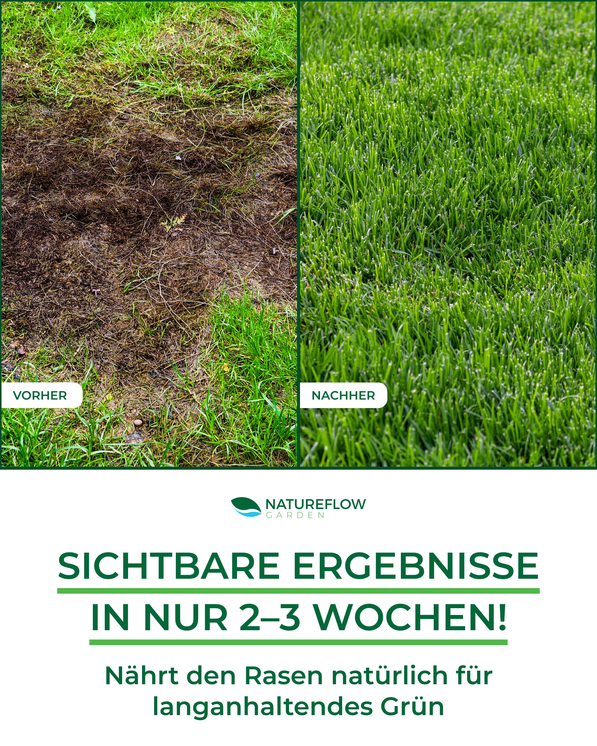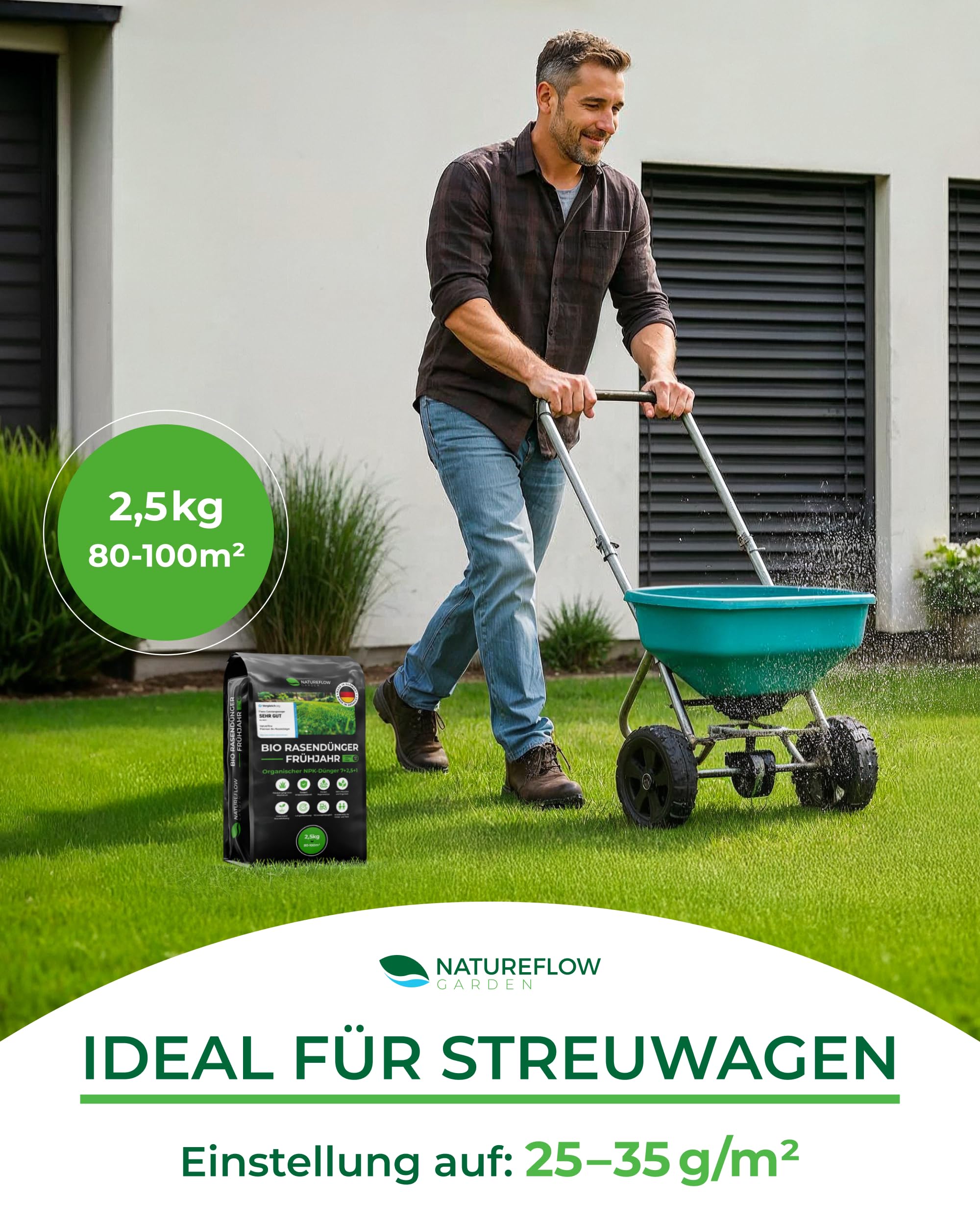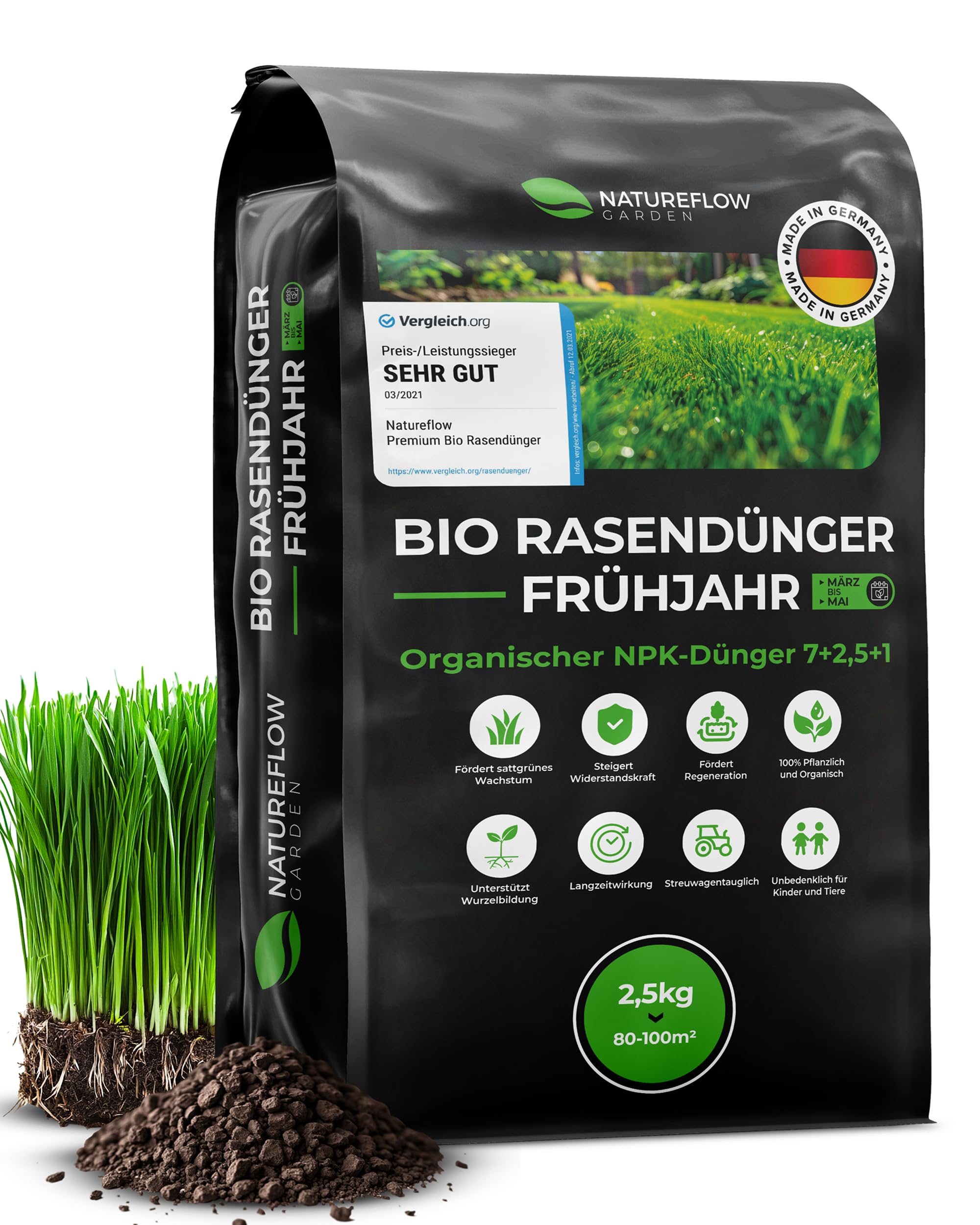 Organiskais zāliena mēslojums pavasara TESTA UZVARĒTĀJS Ražots Vācijā – 2,5 kg uz 100 kv.m – Organiskais zāliena mēslojums veselīgai augsnei un sulīgi zaļam zālienam – Zāliena mēslojums, pavasara zāliena mēslojums no Natureflow Garden