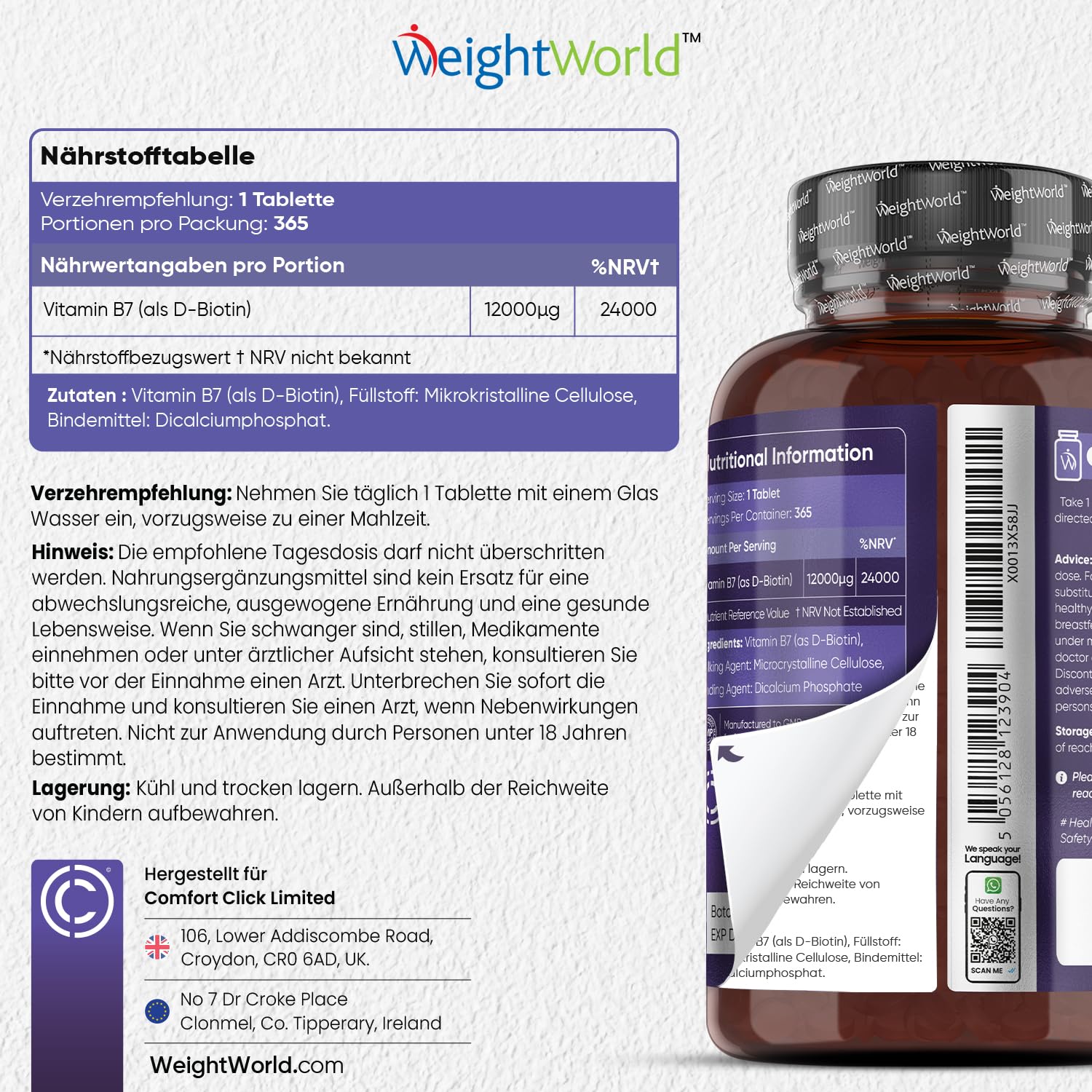 - 365 vegānas tabletes — biotīna tabletes satur 12 000 mcg vienā tabletē. Šajā pudelē ir 365 vegānas tabletes visam gadam. Saskaņā ar EFSA datiem, biotīns (B7 vitamīns) veicina normālu matu un ādas stāvokli.