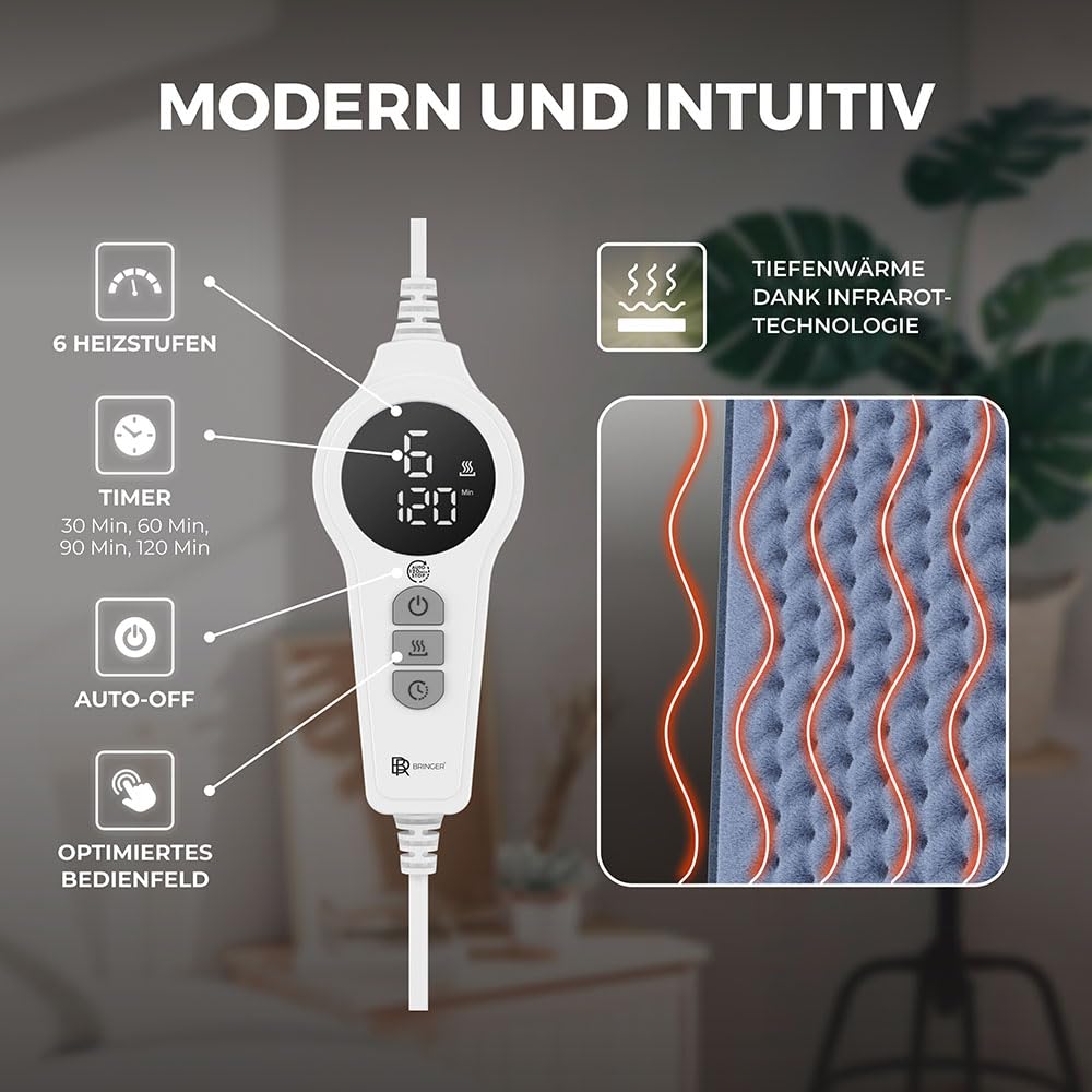 BR Bringer infrasarkanais sildīšanas paliktnis ar automātisku izslēgšanu - sildīšanas paliktnis ar dziļu sildīšanu - 6 siltuma iestatījumi (25-60°C), pārkaršanas aizsardzība, mazgājams, LED displejs, īpaši mīksts flanelis (zils, 60 x 30 cm)