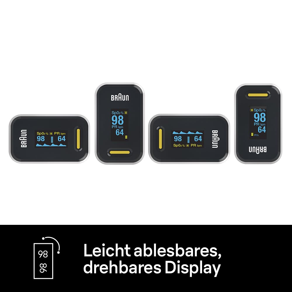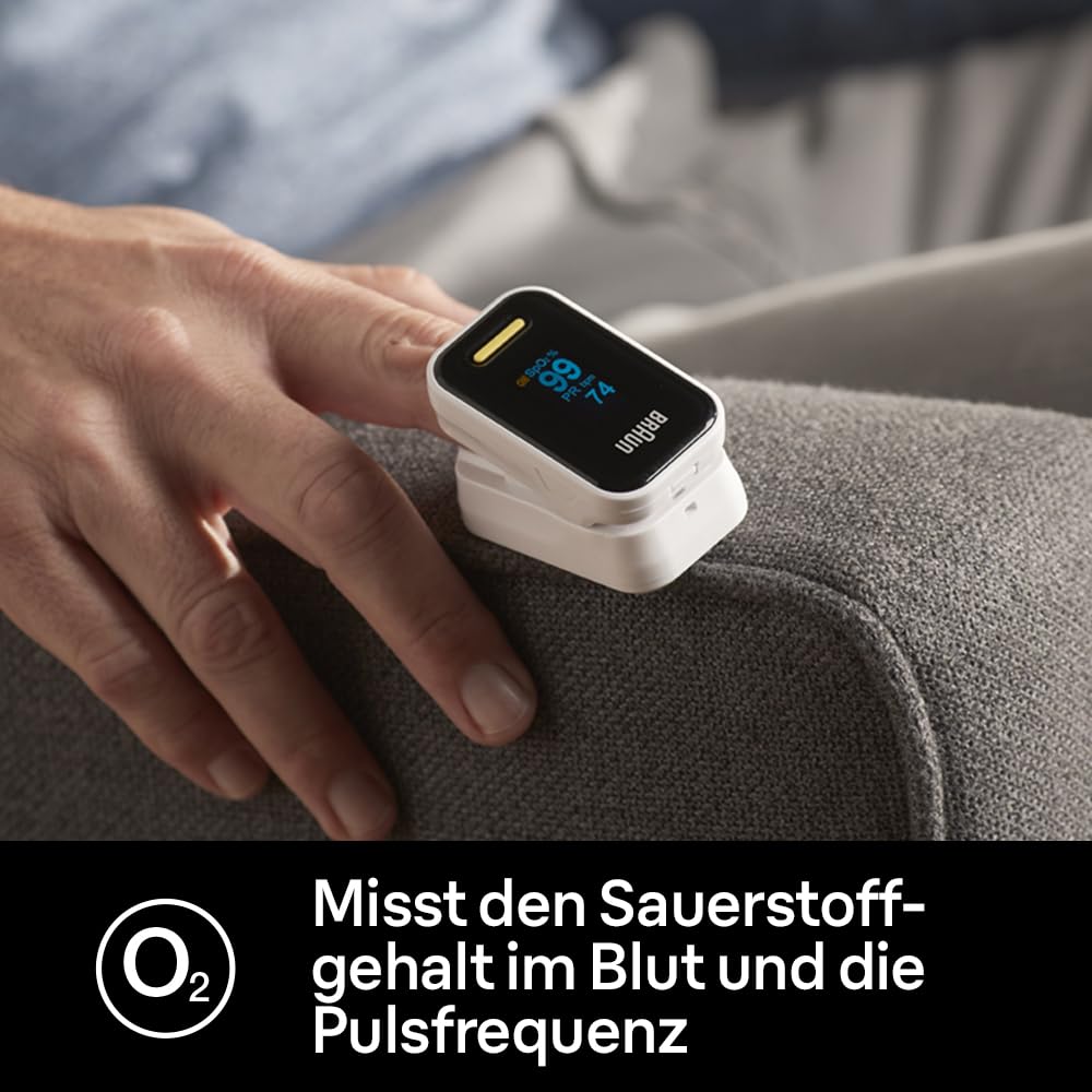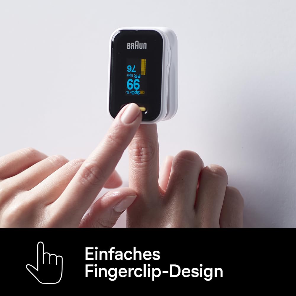 Braun pulsa oksimetrs 1 — pieaugušie no 18 gadu vecuma var kontrolēt savu elpošanas ceļu veselību un uzraudzīt skābekļa līmeni jebkurā laikā un vietā. Tas ir īpaši piemērots cilvēkiem ar HOPS, pneimoniju, miega apnoju vai sportistiem, kuri vēlas uzraudzīt savu progresu. Mūsu Braun pulsa oksimetram 1 ir vienkāršs pirksta klipša dizains un vadība ar vienu pogu. Apgaismotais OLED ekrāns rotē sešos dažādos virzienos, ļaujot ātri redzēt rezultātus no jebkura leņķa. Tas arī automātiski izslēdzas pēc astoņām sekundēm, lai norādītu, ka jūsu pirksts atrodas pareizajā pozīcijā, lai iegūtu precīzākos rādījumus. Komplektā ietilpst kakla siksniņa un divas AAA baterijas.
