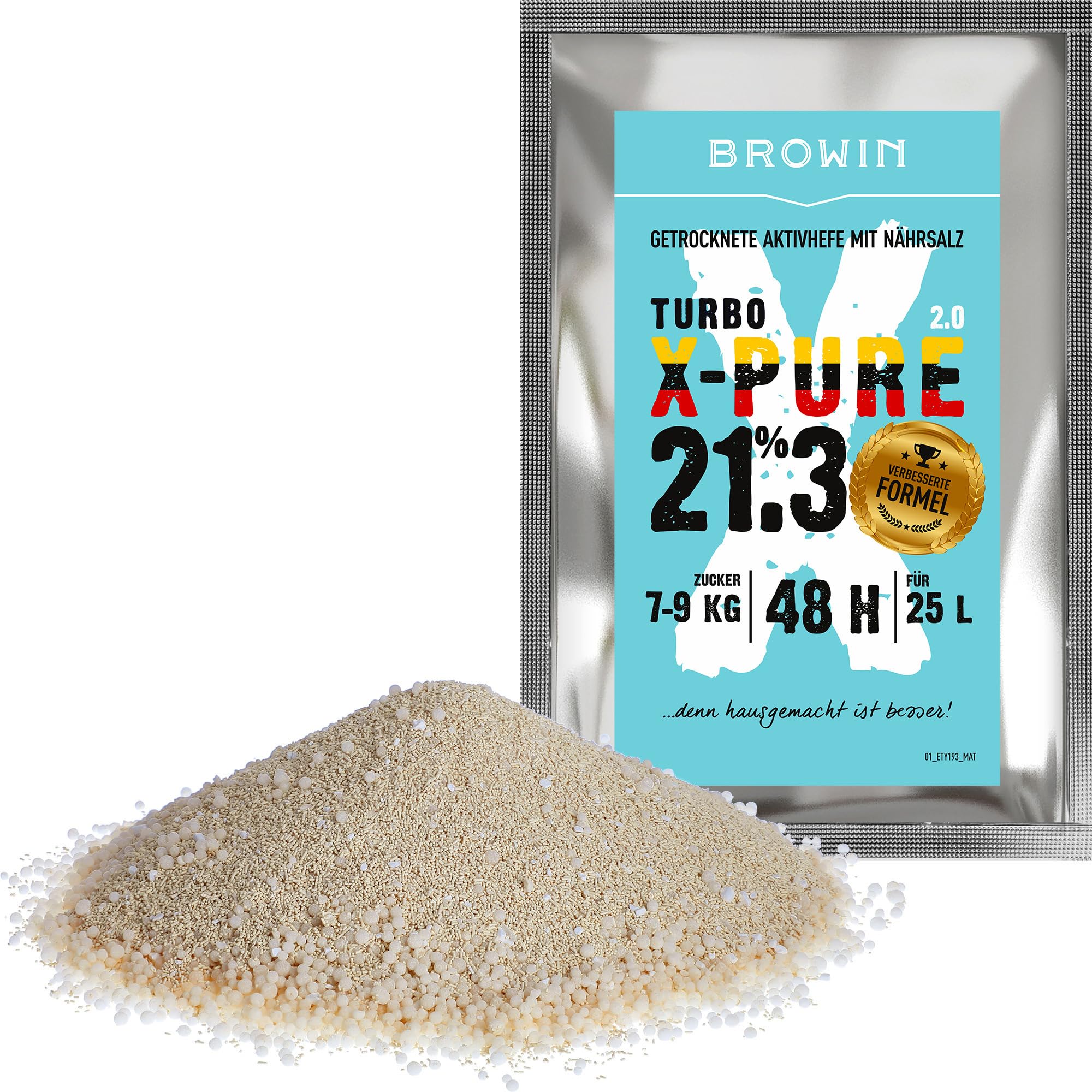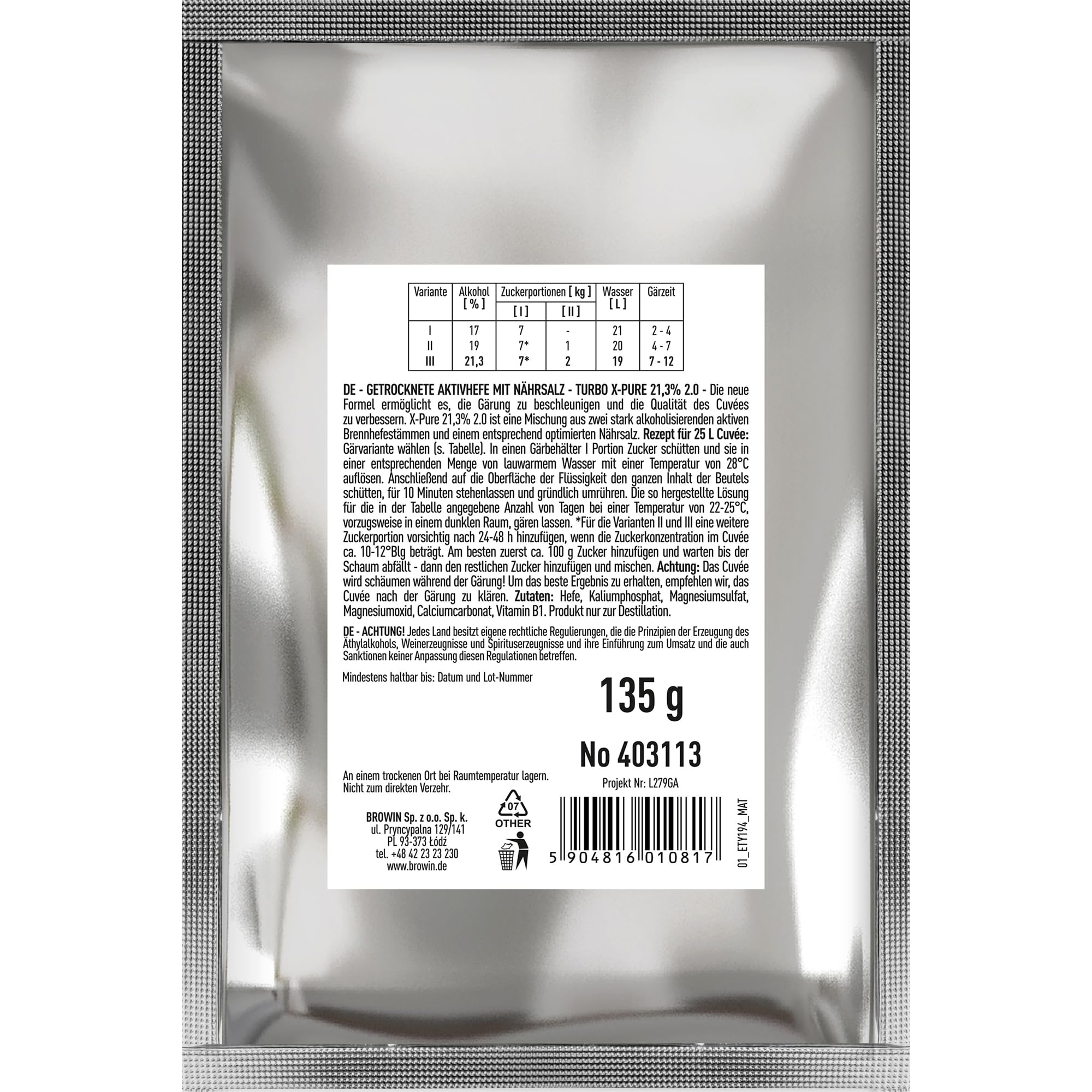 Browin Yeast Turbo X-Pure 403113 augstas kvalitātes fermentācijas raugs destilācijai līdz 21,3% alkohola 48 stundu laikā uz 25 litriem un 7-9 kg cukura 135 g
