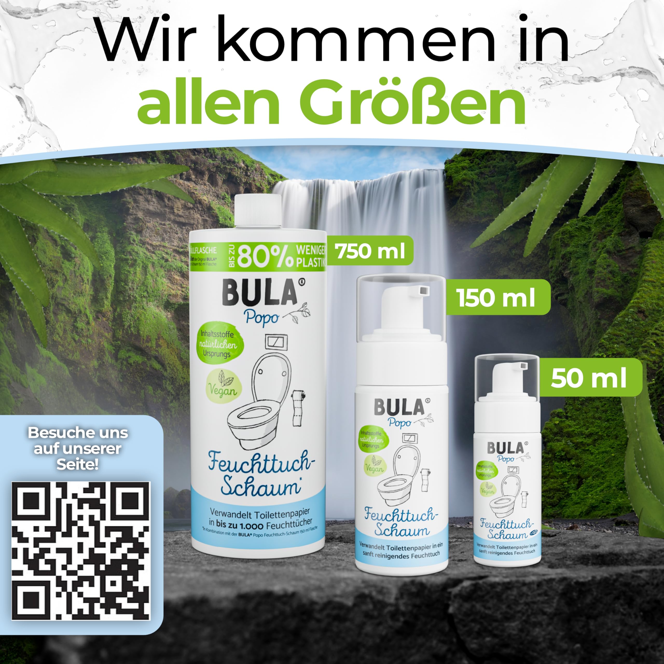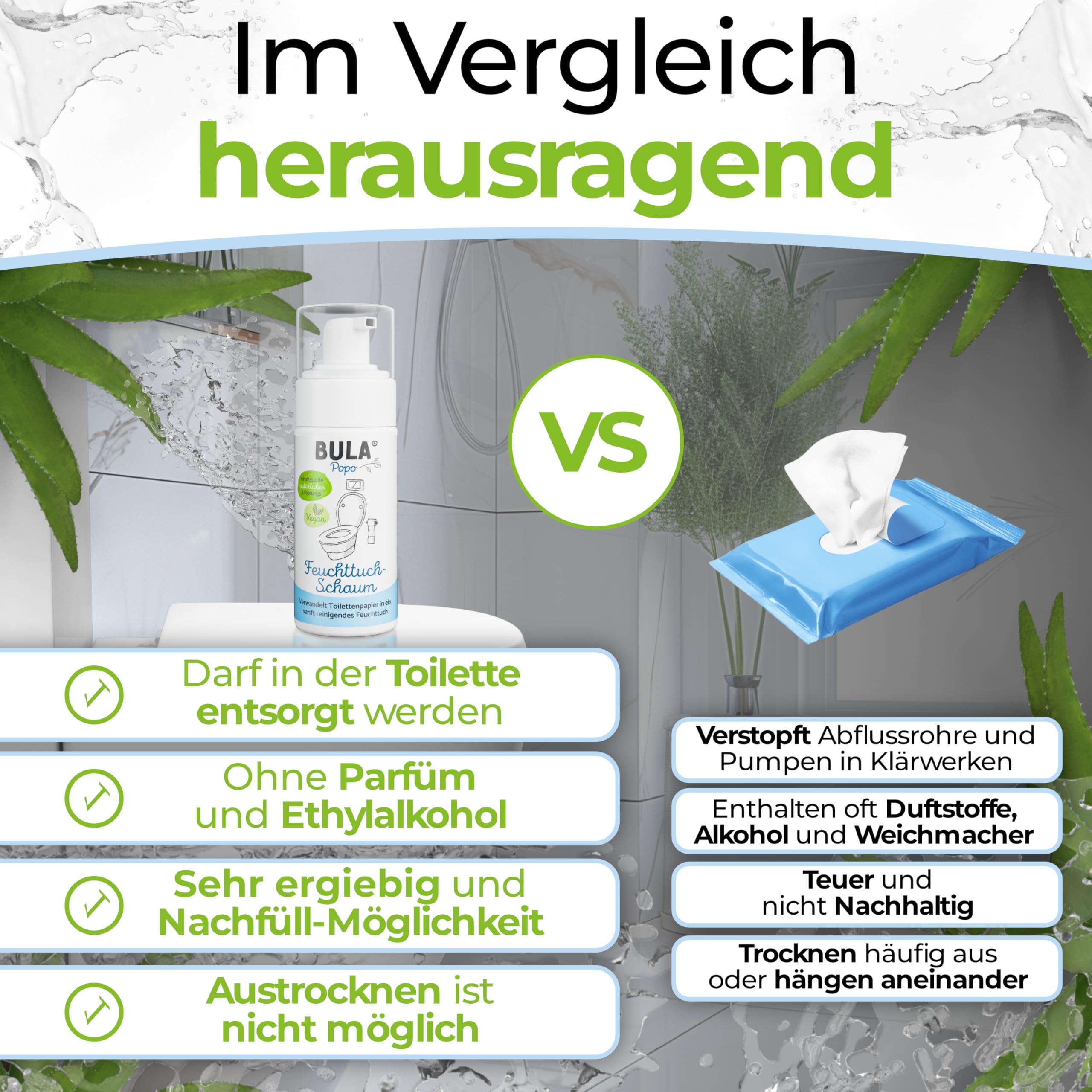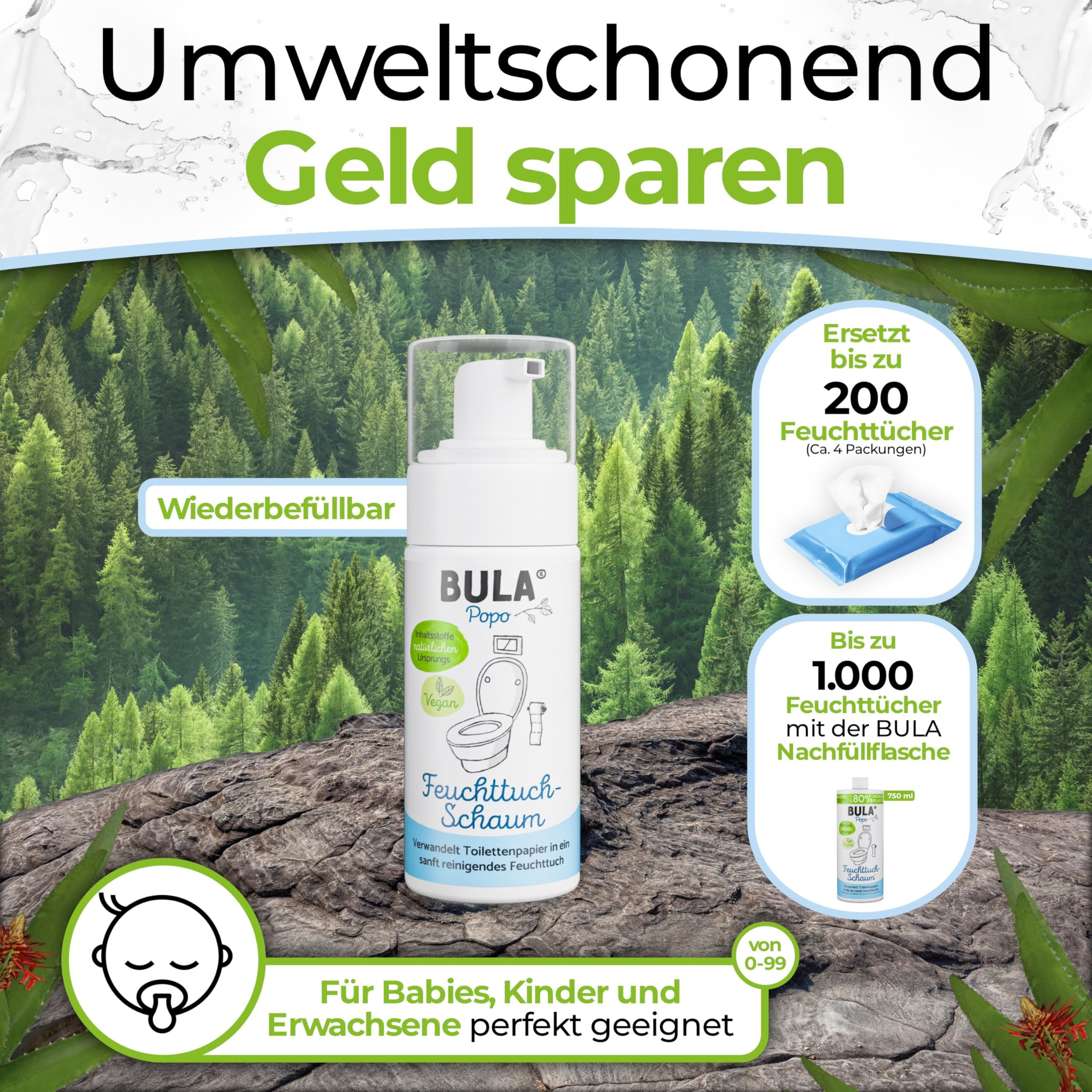 BULA® Popo (zīdaiņiem un tualetes papīram) mitrās salvetes putas 150 ml jūsu tualetes papīram | ilgtspējīga alternatīva vairāk nekā 200 mitrajām salvetēm | dabīgas sastāvdaļas