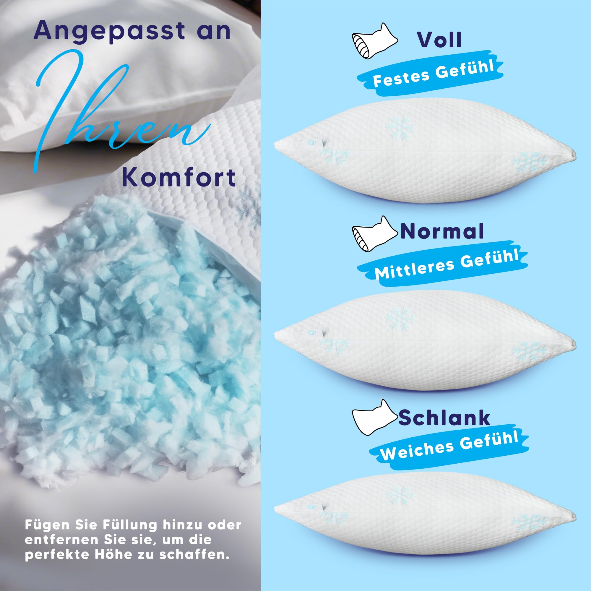 - OEKO-TEX sertificēta spilvendrāna – noņemama un viegli tīrāma: Elegantais auduma pārvalks mirdz jebkurā apgaismojumā un tam ir smalks zils sniegpārsliņu raksts, kas stilīgi papildina jūsu guļamzonu. Pārvalka virsmas slānis ir aprīkots ar inovatīvu dzesēšanas tehnoloģiju, kas uztur jūsu miega vidi svaigu un ērtu. Lūdzu, tīriet noņemamo pārvalku temperatūrā, kas zemāka par 40 grādiem, lai optimāli aizsargātu tā kvalitāti un funkcionalitāti.