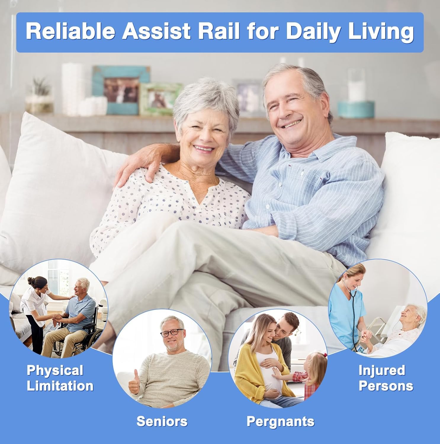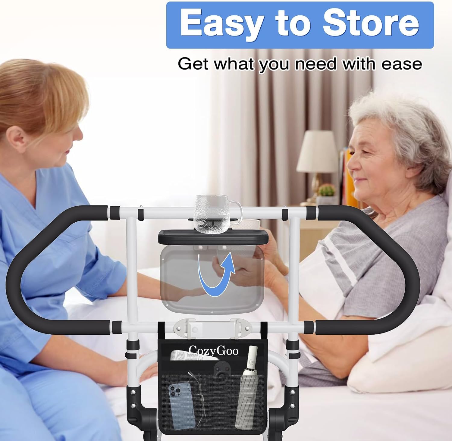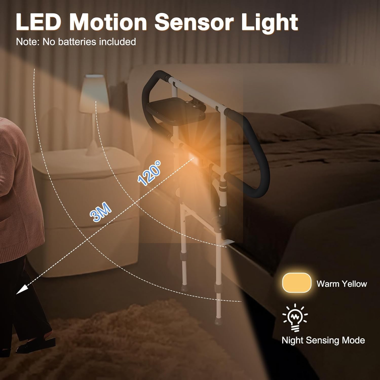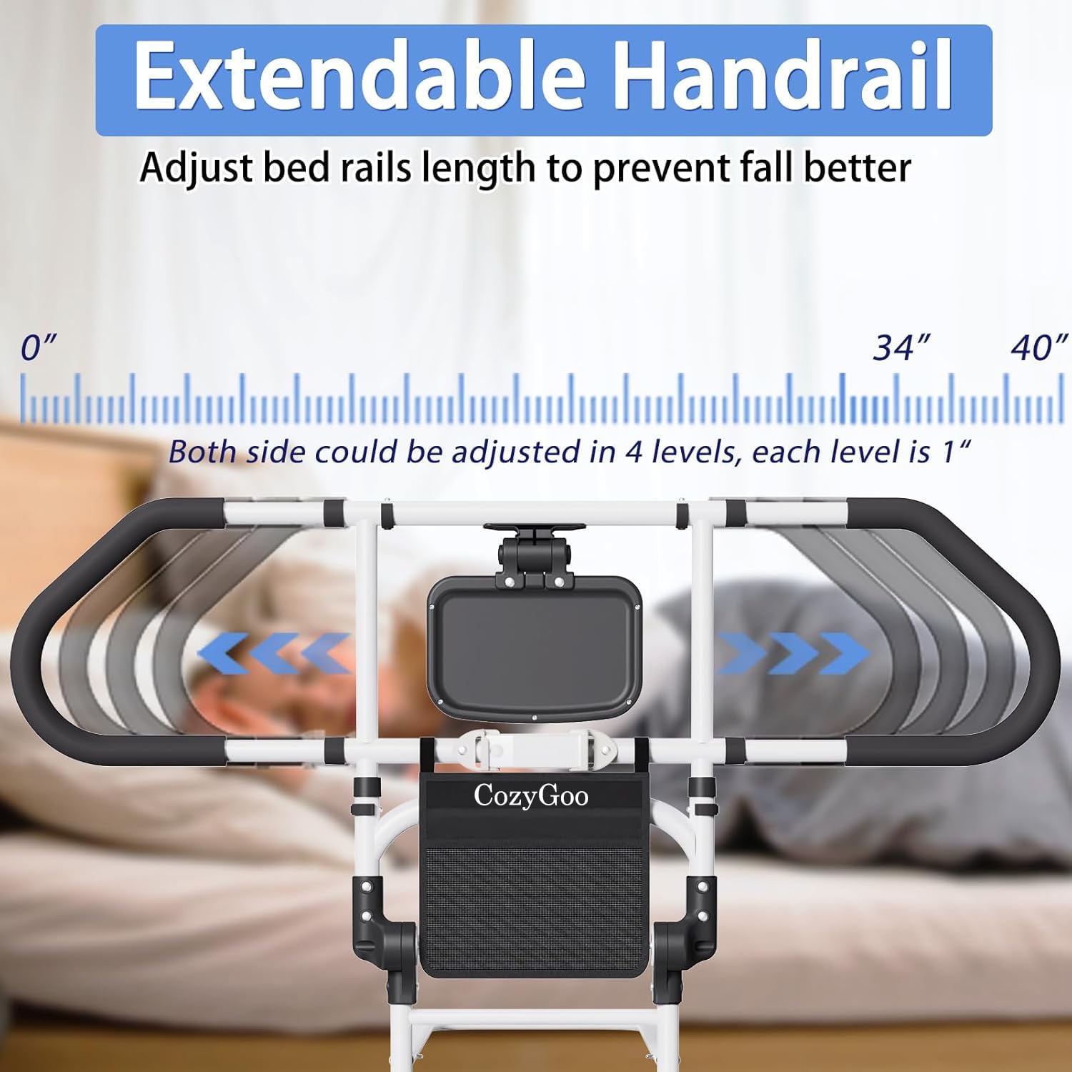 CozyGoo gultas pacēlājs ar sensoru apgaismojumu un augstuma regulēšanu, ergonomiska gultas margas senioriem, izvelkama kritiena aizsardzība ar salocīšanas funkciju, stabila un droša visiem gultas izmēriem