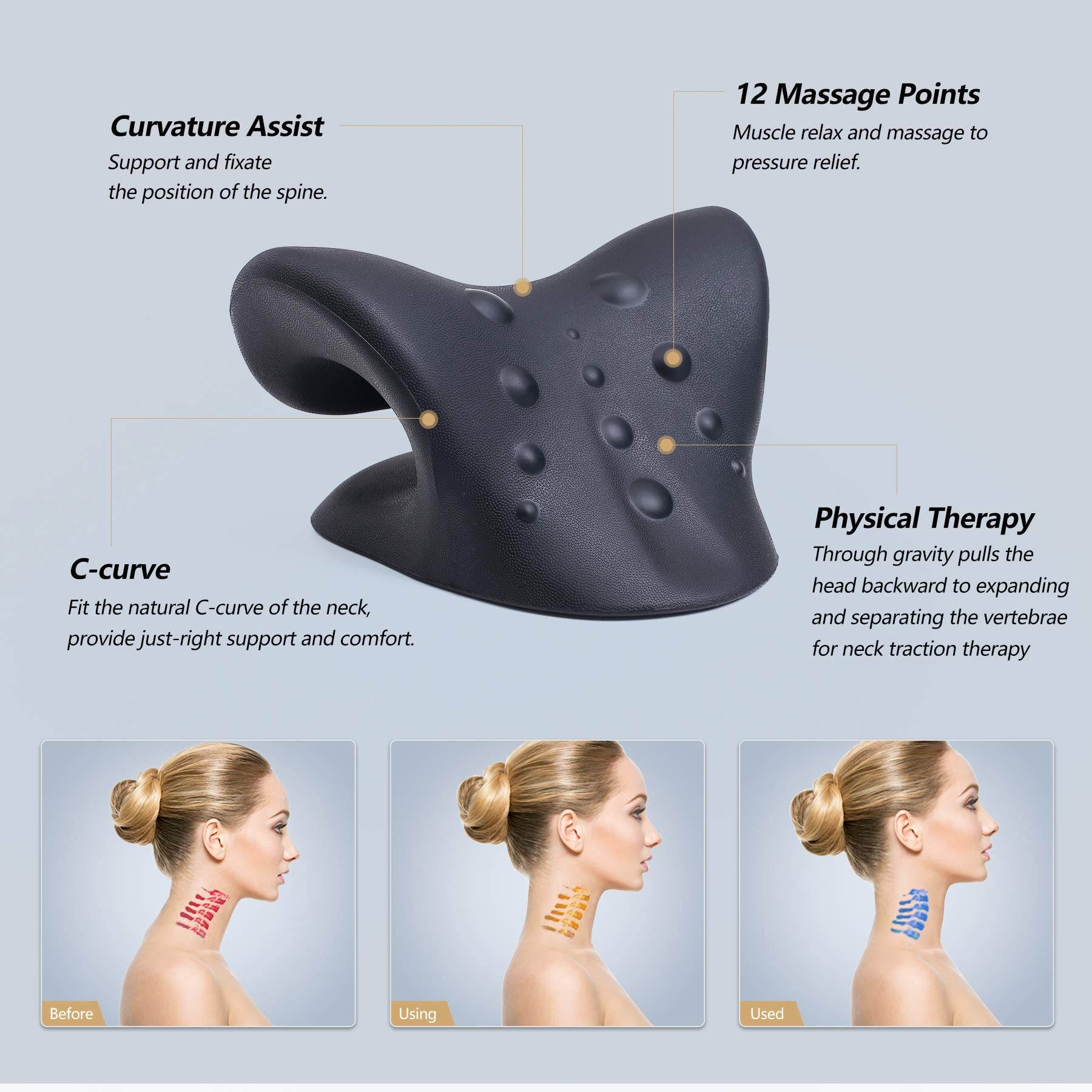 - 【Kakla izliekuma spilvens】Ergonomiskais C veida izliekuma dizains lieliski pielāgojas cilvēka kakla mugurkaulam un nodrošina perfektu kakla mugurkaula vilkmes spilvenu. Apguļoties, tas nodrošina vertikālu un horizontālu atbalstu, kā arī izliekuma stiepšanu kakla vilkšanas terapijai. Tas ļauj kakla nestuvēm maigi novietot galvu, lai samazinātu spiedienu uz mugurkaulu un palīdzētu lietotājiem saglabāt labu mugurkaula stāju.