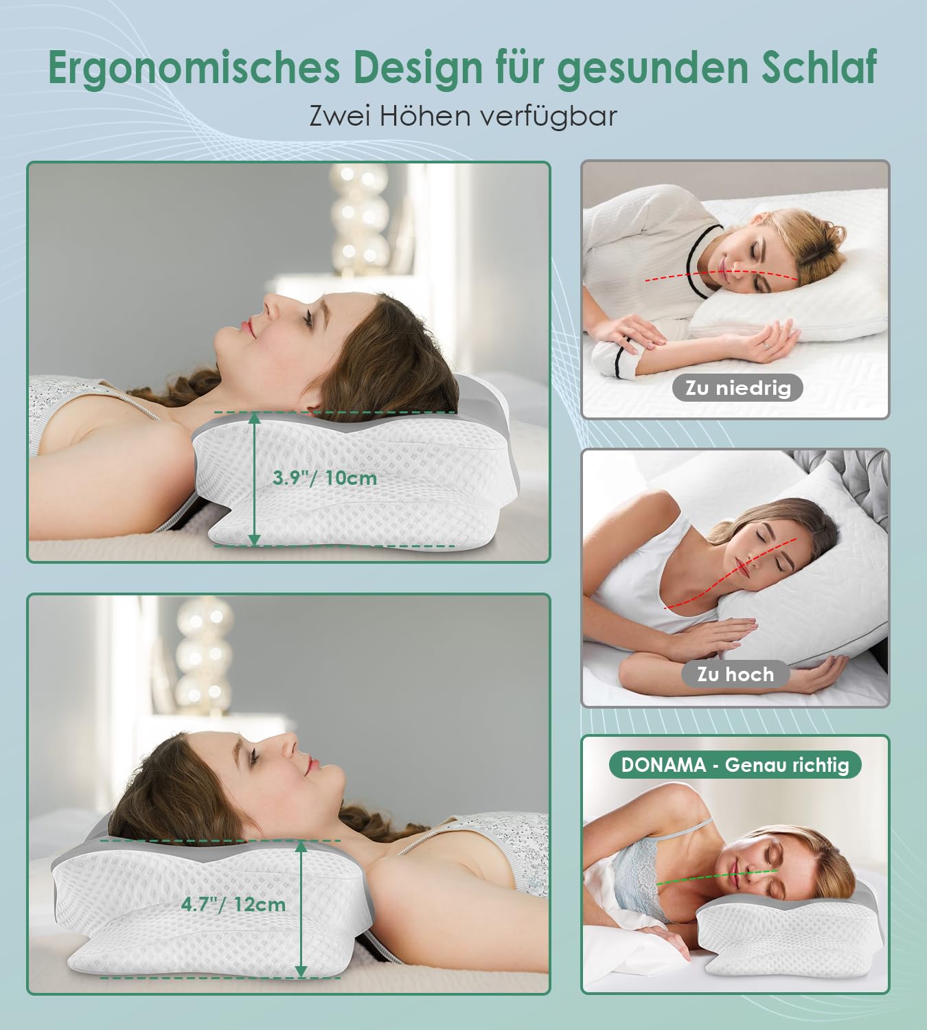 - 𝐕𝐢𝐞𝐥𝐬𝐞𝐢𝐭𝐢𝐠 𝐟𝐫 𝐚𝐥𝐥𝐞 𝐒𝐜𝐡𝐥𝐚𝐟𝐩𝐨𝐬𝐢𝐭𝐢𝐨𝐧𝐞𝐧 – DONAMA kakla spilvens individuāli pielāgojas vēdera, muguras un sānu gulšņiem. Pateicoties tā kontūrveida formai, tas nodrošina vienmērīgu svara sadalījumu neatkarīgi no gulēšanas pozas.
