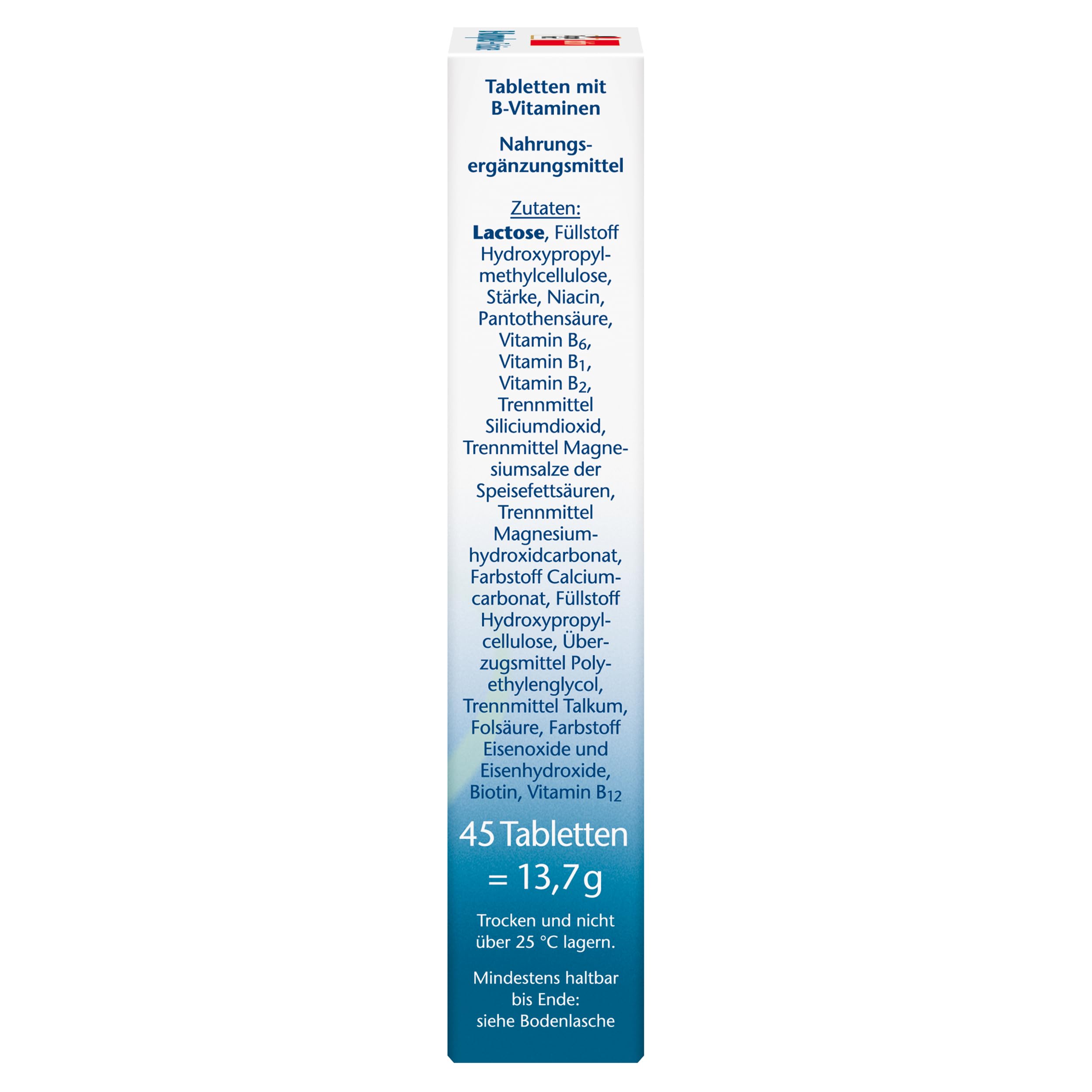 - Iepakojuma saturs: 1 iepakojums ar 45 Doppelherz B-Komplex DEPOT tabletēm / preparāts ar folskābi un visiem 8 B vitamīniem / B vitamīni normālas nervu sistēmas atbalstam / bez glutēna