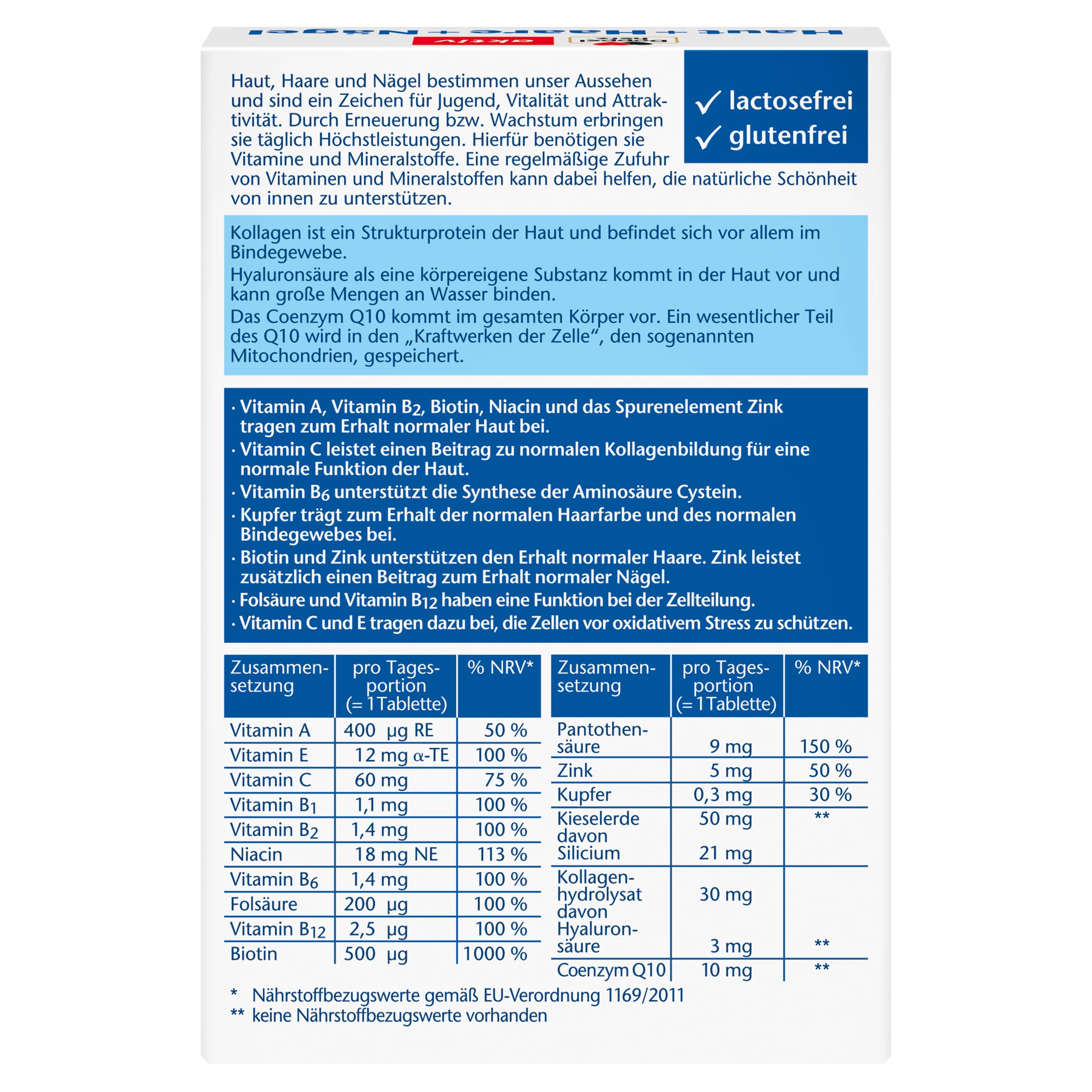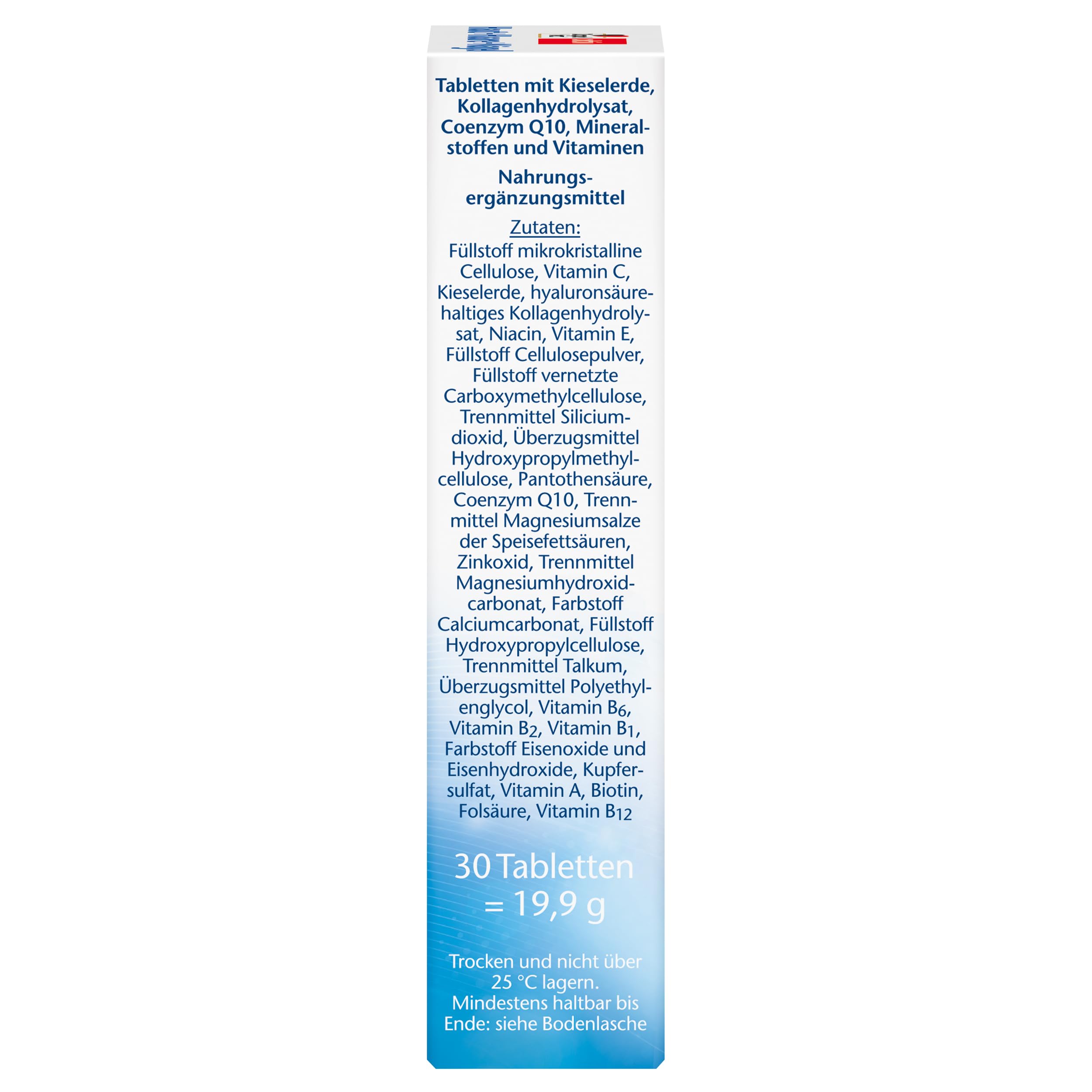 Sastāvdaļas: pildviela mikrokristāliskā celuloze, L-askorbīnskābe, silīcija dioksīds, kolagēna hidrolizāts, kas satur hialuronskābi, nikotīnamīds, DL-alfa-tokoferilacetāts, pildviela celulozes pulveris, pildviela šķērssaistīta karboksimetilceluloze, pretsalipes viela silīcija dioksīds, glazūras viela hidroksipropilmetilceluloze, kalcija D-pantotenāts, koenzīms Q10, pretsalipes viela taukskābju magnija sāļi, cinka oksīds, pretsalipes viela magnija hidroksīda karbonāts, pretsalipes viela kalcija karbonāts, pildviela hidroksipropilceluloze, pretsalipes viela talks, glazūras viela polietilēnglikols, piridoksīna hidrohlorīds, riboflavīns, tiamīna mononitrāts, krāsviela dzelzs oksīdi un dzelzs hidroksīdi, vara sulfāts, retinilacetāts, D-biotīns, pteroilmonoglutamīnskābe, cianokobalamīns.