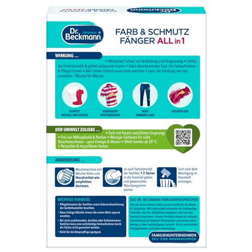 Neskatoties uz rūpīgu šķirošanu, var rasties krāsas maiņa un pelēcība, jo noteikts daudzums krāsvielu vienmēr tiek izskalotas no apģērba un var atkal nosēsties uz tekstilizstrādājumiem. Turklāt, regulāri mazgājot, tekstilizstrādājumi ātri zaudē savu spilgtumu. Atklājiet jauno Dr. Beckmann risinājumu maksimālai krāsas maiņas aizsardzībai ar papildu krāsas un šķiedru kopšanu. Absorbējošā lupatiņa absorbē ūdenī izšķīdušās krāsvielas un tādējādi efektīvi aizsargā krāsainu un baltu veļu no krāsas maiņas un pelēcības. Vienlaikus īpašā kopšanas formula izlīdzina raupjās šķiedras un uzlabo arī krāsas intensitāti. Dr. Beckmann krāsu un netīrumu ķērājs 3in1 – drēbēm, kas izskatās kā jaunas. Ilgtspējīga mazgāšana — visu krāsu mazgāšana kopā = ietaupa enerģiju un ūdeni — piemērots arī mazgāšanai aukstā ūdenī — pārstrādāts un pārstrādājams iepakojums — audums ar dabiskas izcelsmes šķiedrām — ideāli piemērots visiem daudzkrāsainiem apģērbiem ar rakstiem, svītrām vai pat jauktai mazgāšanai ar baltu veļu. Lietošana: 1. Piepildiet veļas mašīnu ar veļu kā parasti un pievienojiet mazgāšanas līdzekli, kā ieteikts. 2. Atkarībā no tekstilizstrādājumu krāsas intensitātes ievietojiet veļas mazgājamās mašīnas cilindrā 1–2 drānas un ieslēdziet vēlamo mazgāšanas programmu. 3. Pēc mazgāšanas izmetiet drānu sadzīves atkritumos. Noderīgi padomi — ievērojiet tekstilizstrādājumu kopšanas norādījumus. - Lūdzu, skatiet ierīces ražotāja lietošanas instrukciju. - Pirmās pāris reizes jaunu krāsaino veļu mazgājiet atsevišķi. Stipri krāsojošiem, tumšiem, intensīvas krāsas audumiem: Dr. Izmantojiet Beckmann Paint & Dirt Catcher ULTRA. - Ja ir liels daudzums stipri atkrāsojušos tekstilizstrādājumu, nevar garantēt pilnīgu krāsas absorbciju ar salvetēm. - Nav piemērots personīgai higiēnai. - Rakstainu tekstilizstrādājumu ar baltu komponentu gadījumā krāsas maiņa un pelēcība var rasties pat pēc rūpīgas šķirošanas, jo noteikts daudzums krāsvielu vienmēr tiek izskalots no apģērba un var atkal nosēsties uz tekstilizstrādājumiem. Turklāt, regulāri mazgājot, tekstilizstrādājumi ātri zaudē savu spilgtumu. Atklājiet jauno Dr. Beckmann risinājumu maksimālai krāsas maiņas aizsardzībai ar papildu krāsas un šķiedru kopšanu. Absorbējošā lupatiņa absorbē ūdenī izšķīdušās krāsvielas un tādējādi efektīvi aizsargā krāsainu un baltu veļu no krāsas maiņas un pelēcības. Vienlaikus īpašā kopšanas formula izlīdzina raupjās šķiedras un uzlabo arī krāsas intensitāti. Dr. Beckmann krāsu un netīrumu ķērājs 3in1 – drēbēm, kas izskatās kā jaunas. Ilgtspējīga mazgāšana — visu krāsu mazgāšana kopā = ietaupa enerģiju un ūdeni — piemērots arī mazgāšanai aukstā ūdenī — pārstrādāts un pārstrādājams iepakojums — audums ar dabiskas izcelsmes šķiedrām Ideāli piemērots visiem daudzkrāsainiem apģērbiem ar rakstiem, svītrām vai pat jauktai mazgāšanai ar baltu drēbi. Lietošana: 1. Piepildiet veļas mašīnu ar veļu kā parasti un pievienojiet mazgāšanas līdzekli, kā ieteikts. 2. Atkarībā no tekstilizstrādājumu krāsas intensitātes ievietojiet veļas mazgājamās mašīnas cilindrā 1–2 drānas un ieslēdziet vēlamo mazgāšanas programmu. 3. Pēc mazgāšanas izmetiet drānu sadzīves atkritumos. Noderīgi padomi — ievērojiet tekstilizstrādājumu kopšanas norādījumus. - Lūdzu, skatiet ierīces ražotāja lietošanas instrukciju. - Pirmās pāris reizes jaunu krāsaino veļu mazgājiet atsevišķi. Stipri krāsojošiem, tumšiem, intensīvas krāsas audumiem: Dr. Izmantojiet Beckmann Paint & Dirt Catcher ULTRA. - Ja ir liels daudzums stipri atkrāsojušos tekstilizstrādājumu, nevar garantēt pilnīgu krāsas absorbciju ar salvetēm. - Nav piemērots personīgai higiēnai. - Rakstainiem audumiem ar baltām daļām vienmēr izmantojiet krāsaino apģērbu mazgāšanas līdzekli (šeit varat uzzināt visu par drēbju mazgāšanu).