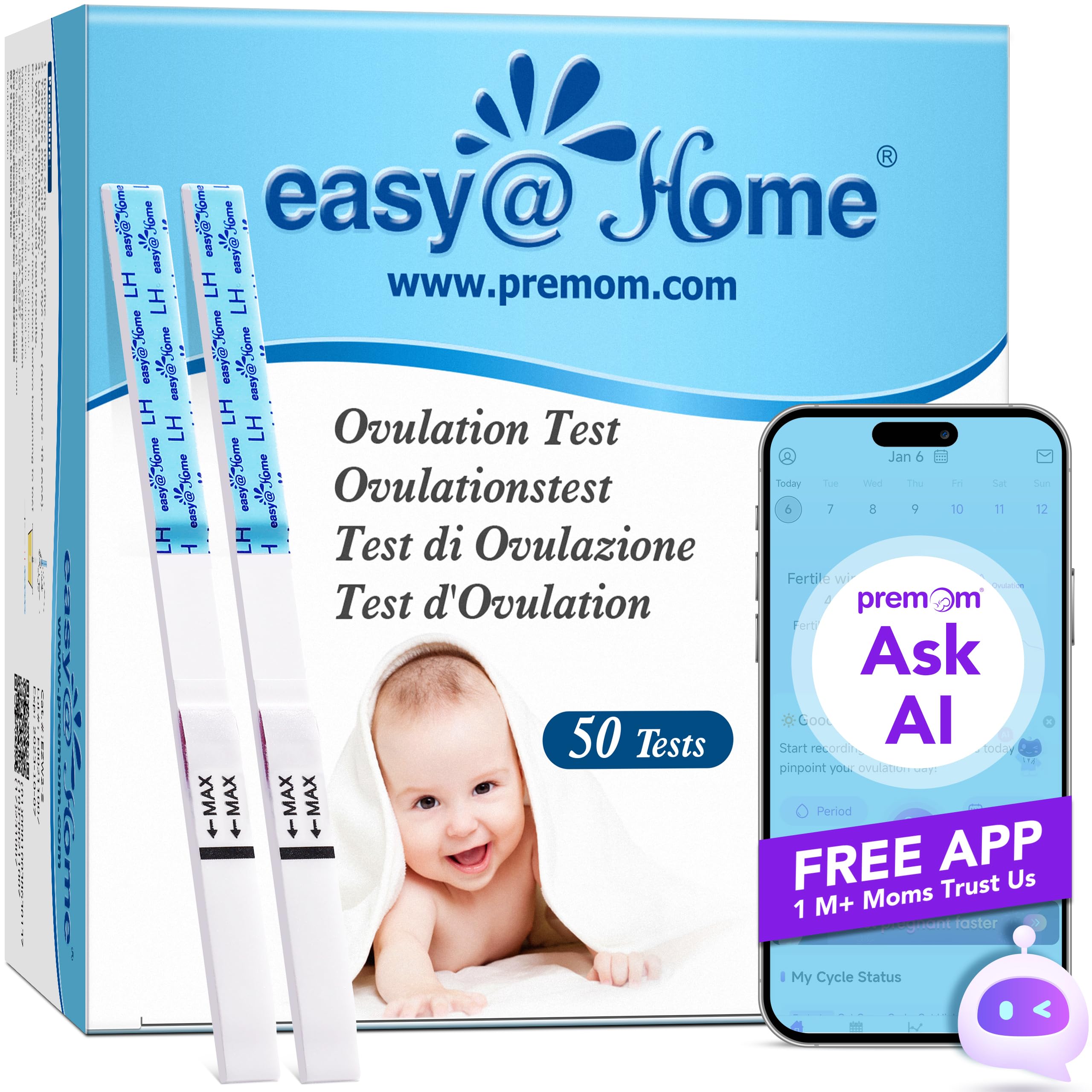 Easy@Home auglības tests 50 ovulācijas testi auglības testi ovulācijai – atbalsta bezmaksas Premom Ovulation lietotne, 50 LH testi