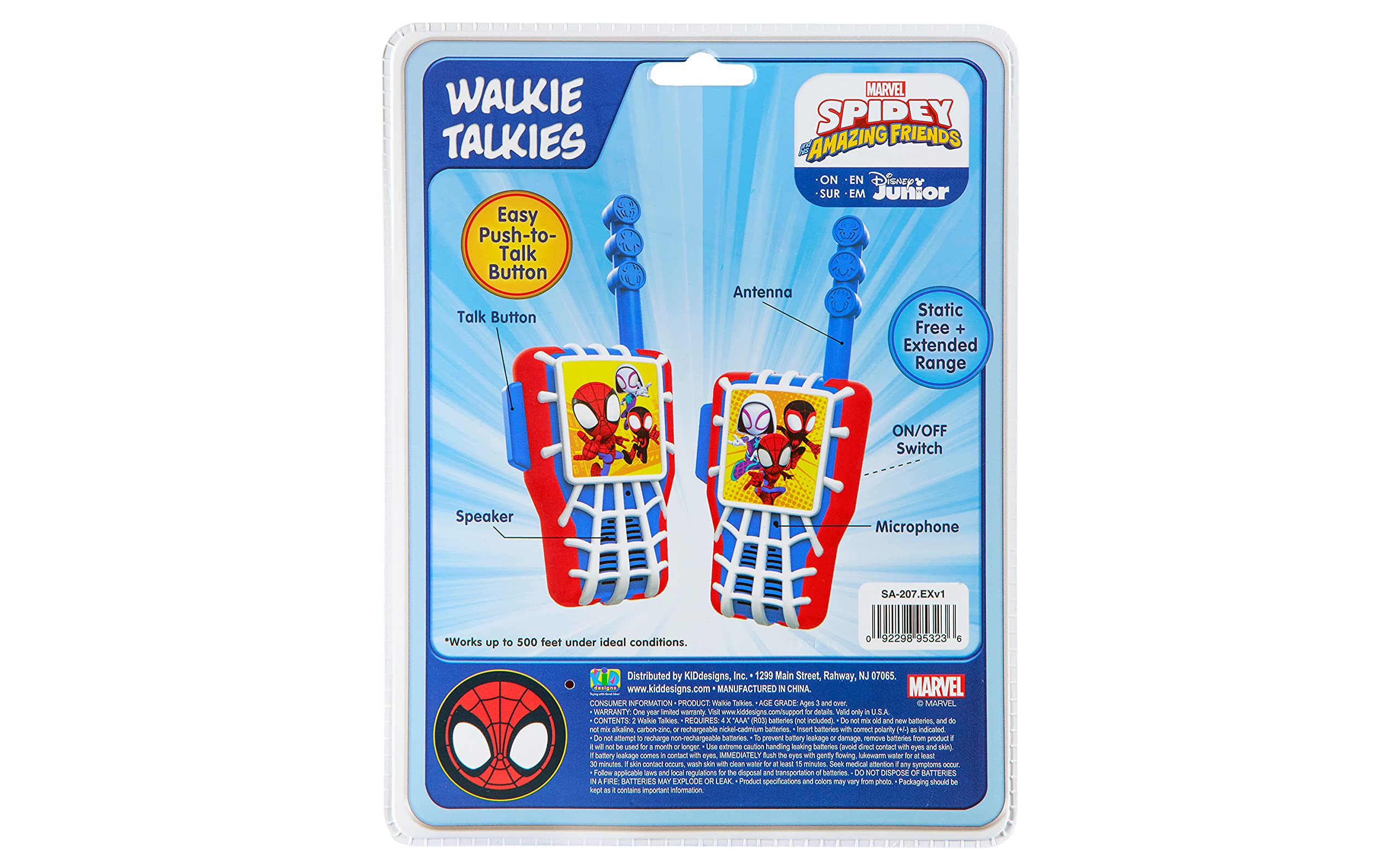 Sīkāka informācija: eKids Spidey un viņa apbrīnojamie draugi rācijas Divvirzienu rācijas spēlēm iekštelpās un ārā eKids Spidey rācijas ir gatavas daudz jautrības! Šiem radioaparātiem ir stilīgs un krāsains dizains ar jūsu iecienītākajiem varoņiem, kā arī ērti lietojamas, bērniem draudzīgas vadības ierīces. Sūtiet statiskas bezmaksas ziņas ar vienu pogas pieskārienu, kopā spēlējot spēles telpās vai ārā. Šīs Zirnekļcilvēka rotaļlietas patiks gan zēniem, gan meitenēm no 3 gadu vecuma!