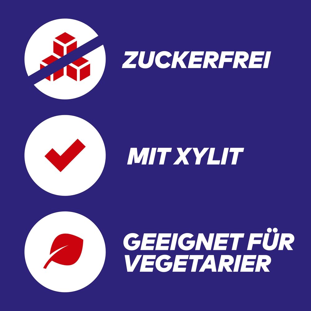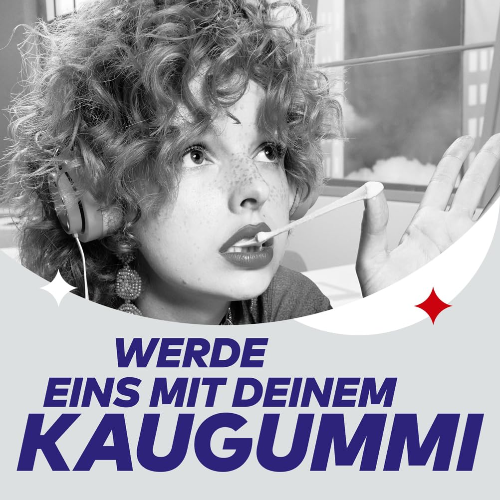 Košļājamās gumijas bāze, saldinātāji (ksilitols, sorbitols), biezinātājs (gumiarabiks), mitrinātājs (glicerīns), aromatizētāji, pildviela (kalcija fosfāti), emulgators (sojas lecitīns), saldinātāji (aspartāms, acesulfāms K), skābuma regulētājs (nātrija hidrogēnkarbonāts), glazūras līdzeklis (karnaubas vasks), antioksidants (BHA), krāsviela (E133). Pārmērīgas lietošanas gadījumā var būt caureju veicinoša iedarbība. Satur fenilalanīna avotu.