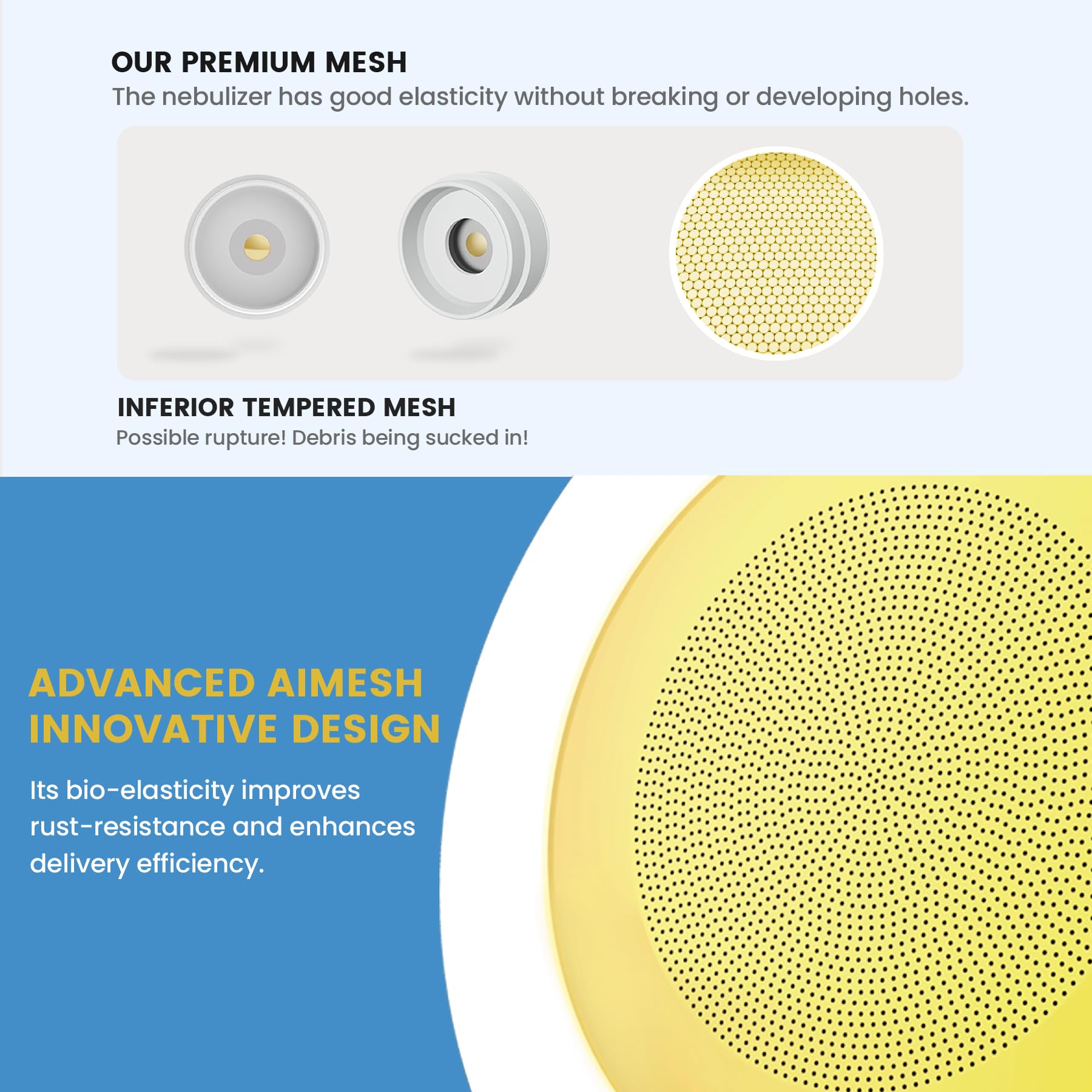 - 【AIMESH tehnoloģija】Feellife inhalators izmanto AIMESH tehnoloģiju — mikroporainu membrānu, kas izgatavota no polimēru strukturāliem materiāliem. Polimēra membrānas vibrācijas atomizē šķidrumu. Augstais alveolāro daļiņu īpatsvars (MMAD: 4,52 µm) un aerosolizācijas veiktspēja (≥0,4 ml/min) nodrošina mērķtiecīgu ārstēšanu. Efektīva medikamentu piegāde ar zemu atlikumu daudzumu, medikamentu atlikumu daudzums ir mazāks par 0,1 ml.
