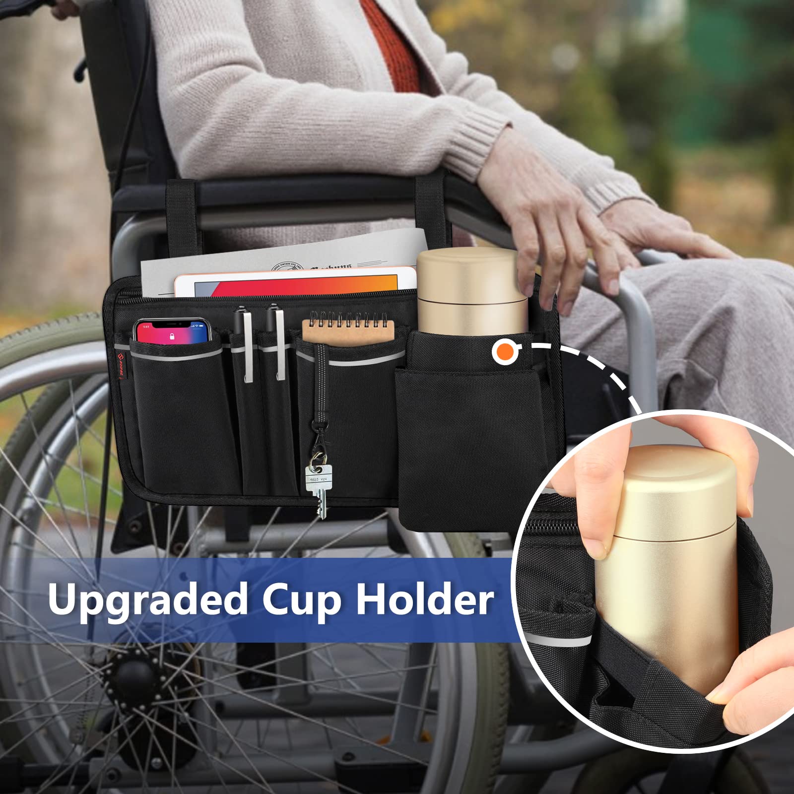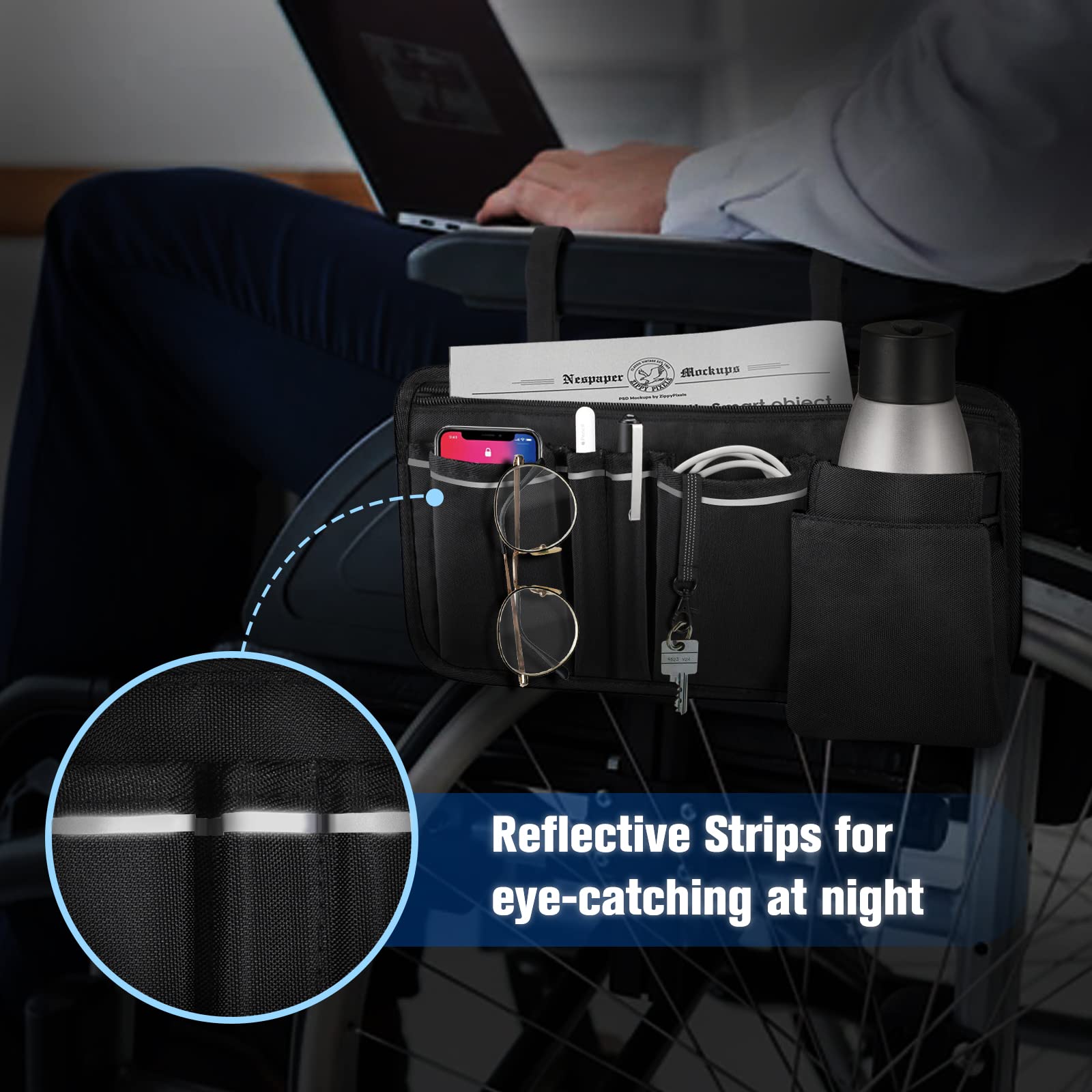 FINPAC ratiņkrēsla soma roku balstam - ratiņkrēsla soma ar pudeles turētāju un atstarojošām svītrām, ratiņkrēsla soma staigulīšiem, mobilitātes skrejriteņiem, rollatoriem (melna)