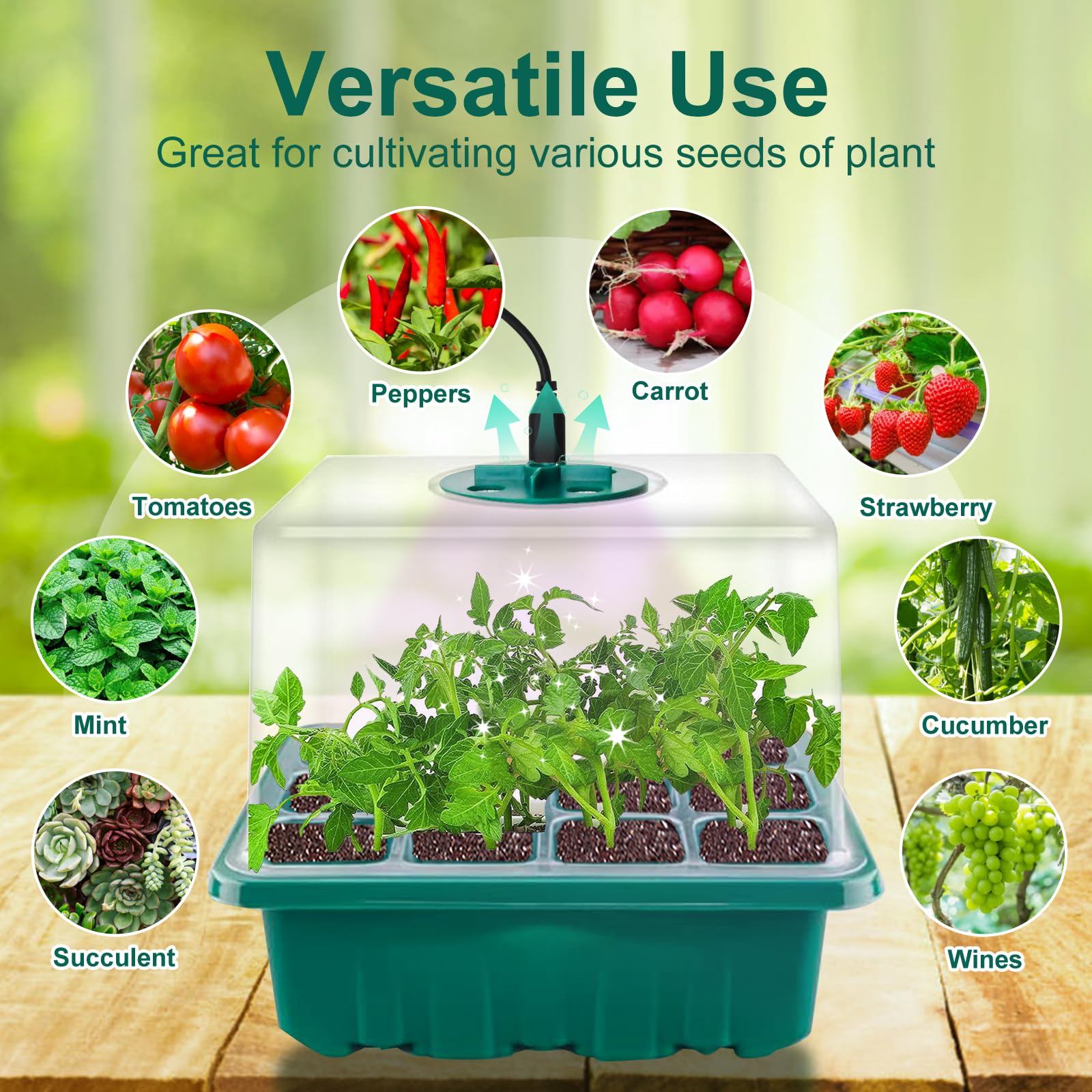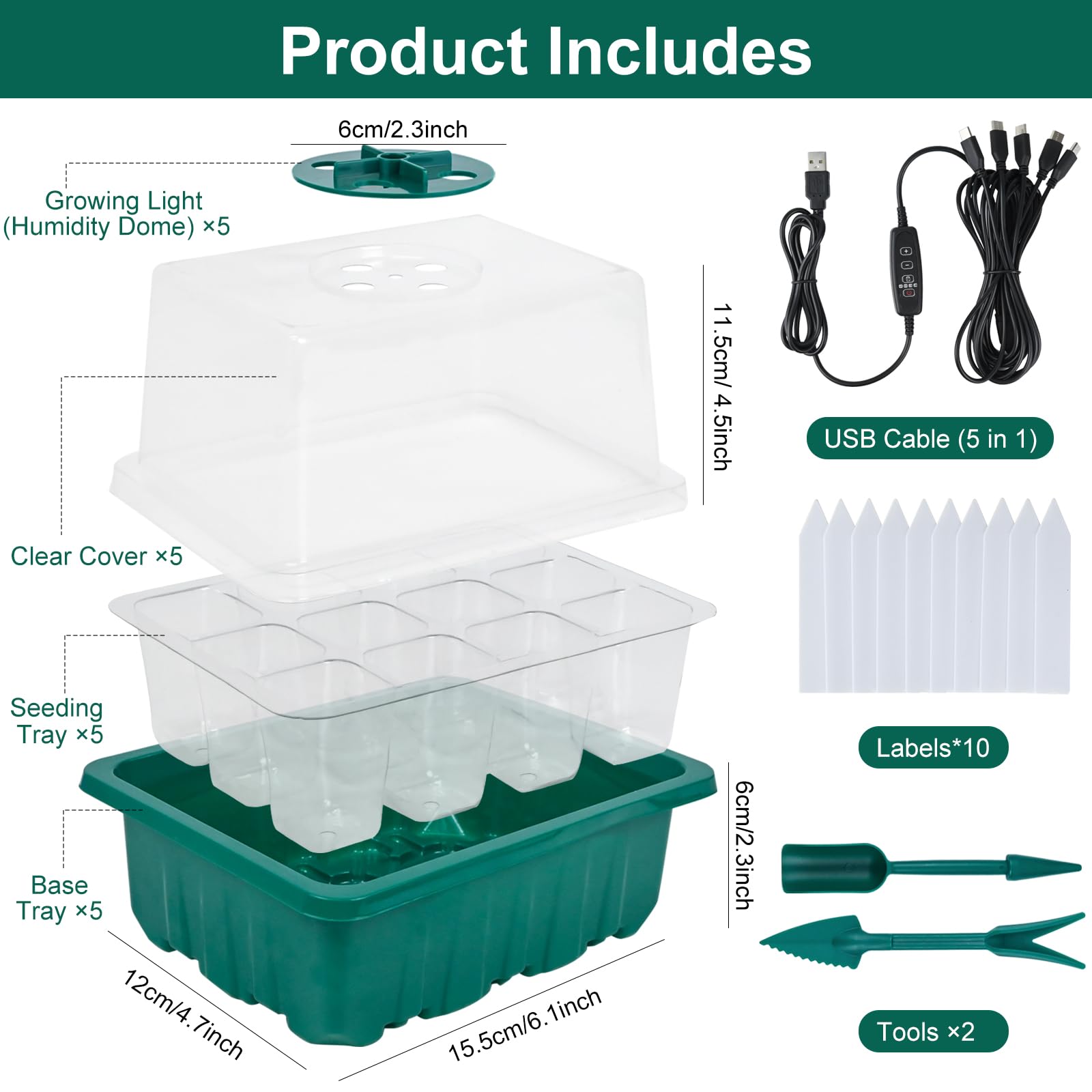 - 🌱【Viegli lietojams】Mini siltumnīca ir aprīkota ar USB kabeli, kuram vienlaikus var pievienot 5 mini siltumnīcas stādu kastes, kas ir ļoti ērti. Katrā stādu kastītē ir 12 nodalījumi, kā arī instrumenti un etiķetes ērtai sēšanai, augsnes irdināšanai, pārstādīšanai un marķēšanai.
