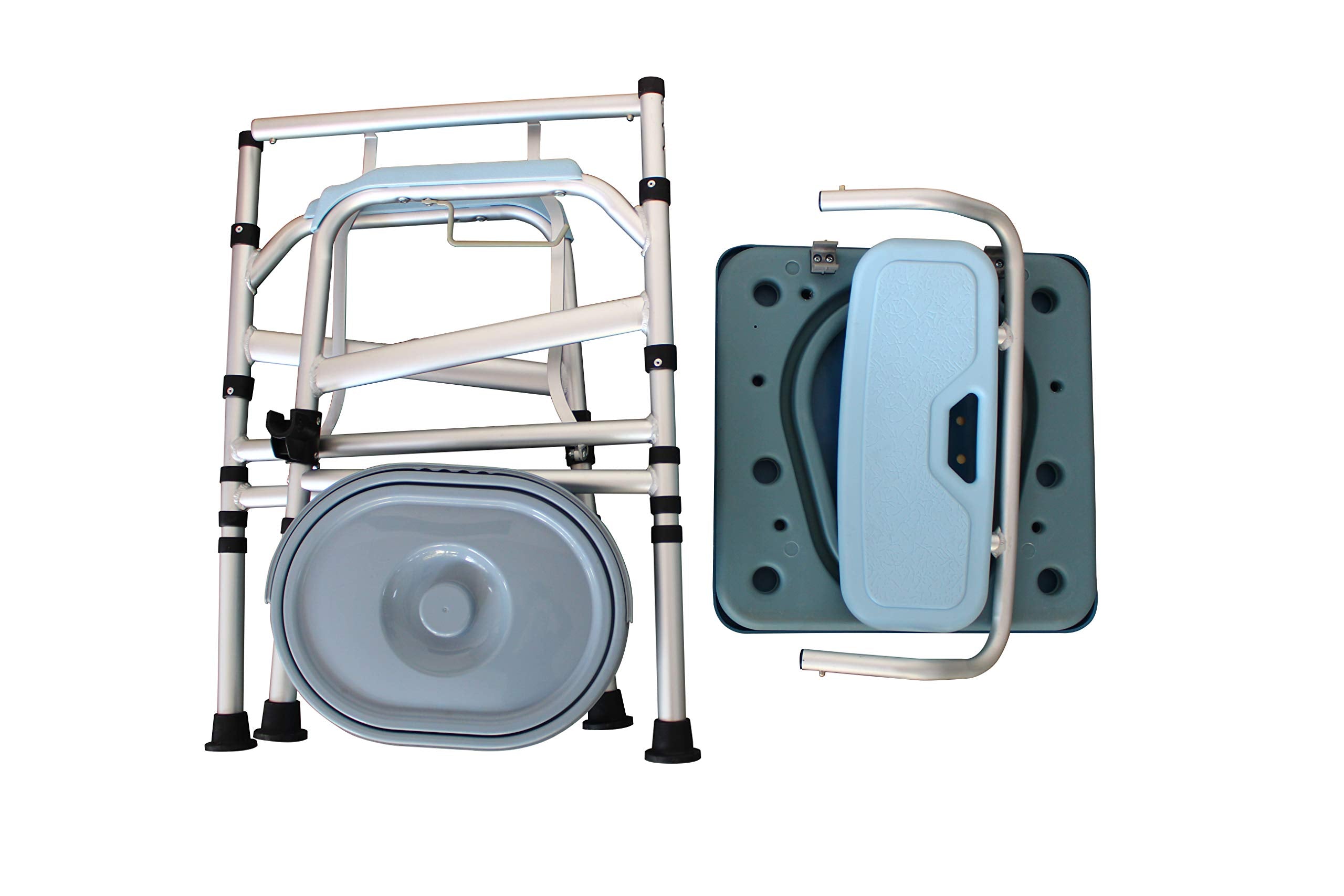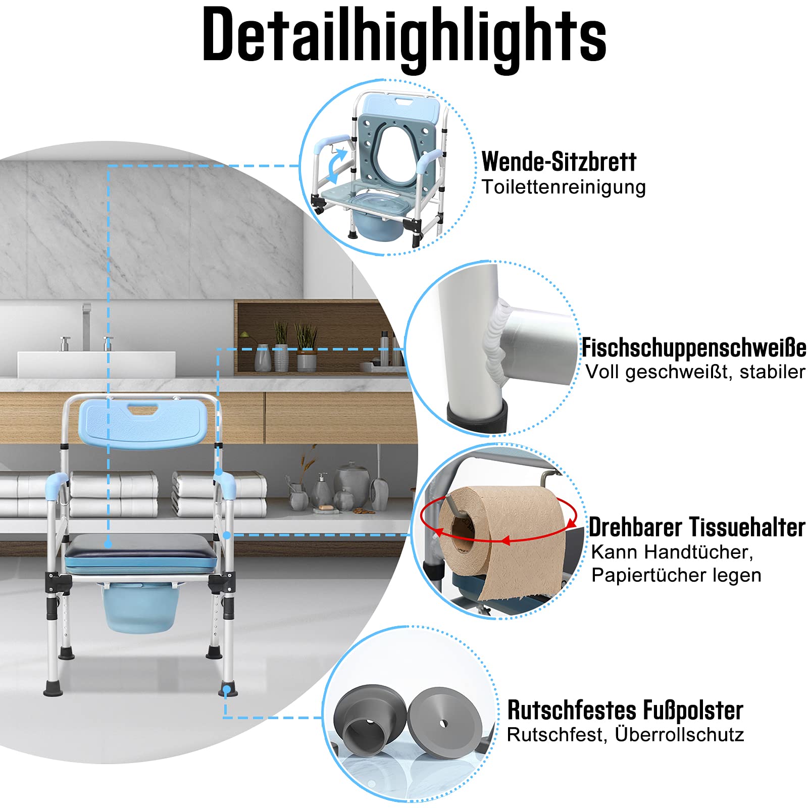 - 【Plašs pielietojuma klāsts】Ar integrētu PU sēdekļa spilvenu tualetes krēslu var izmantot arī kā krēslu, un sēdekļa rāmi un kronšteinu var salocīt un izjaukt. Plašs pielietojumu klāsts: guļamistabas, vannas istabas, kajītes, sniedziet saviem mīļajiem visintīmāko aprūpi.