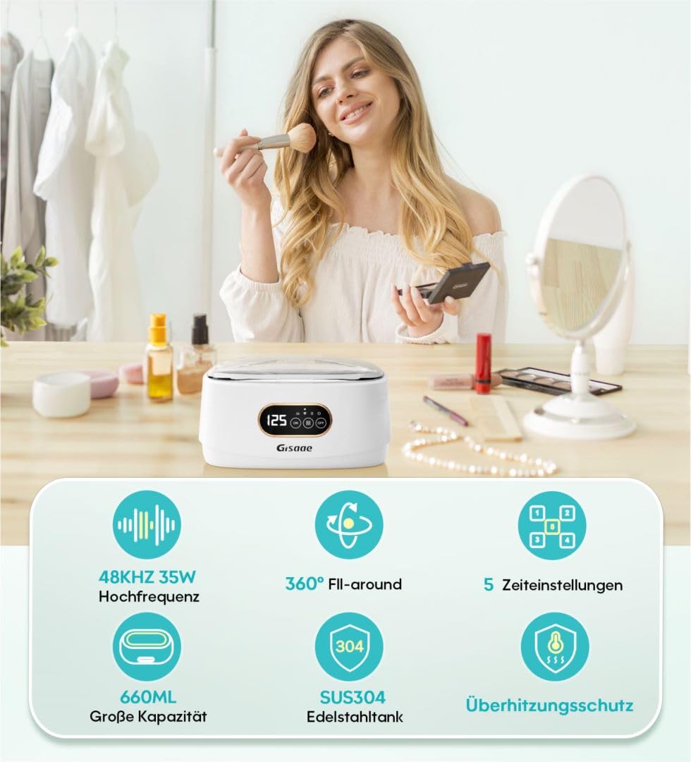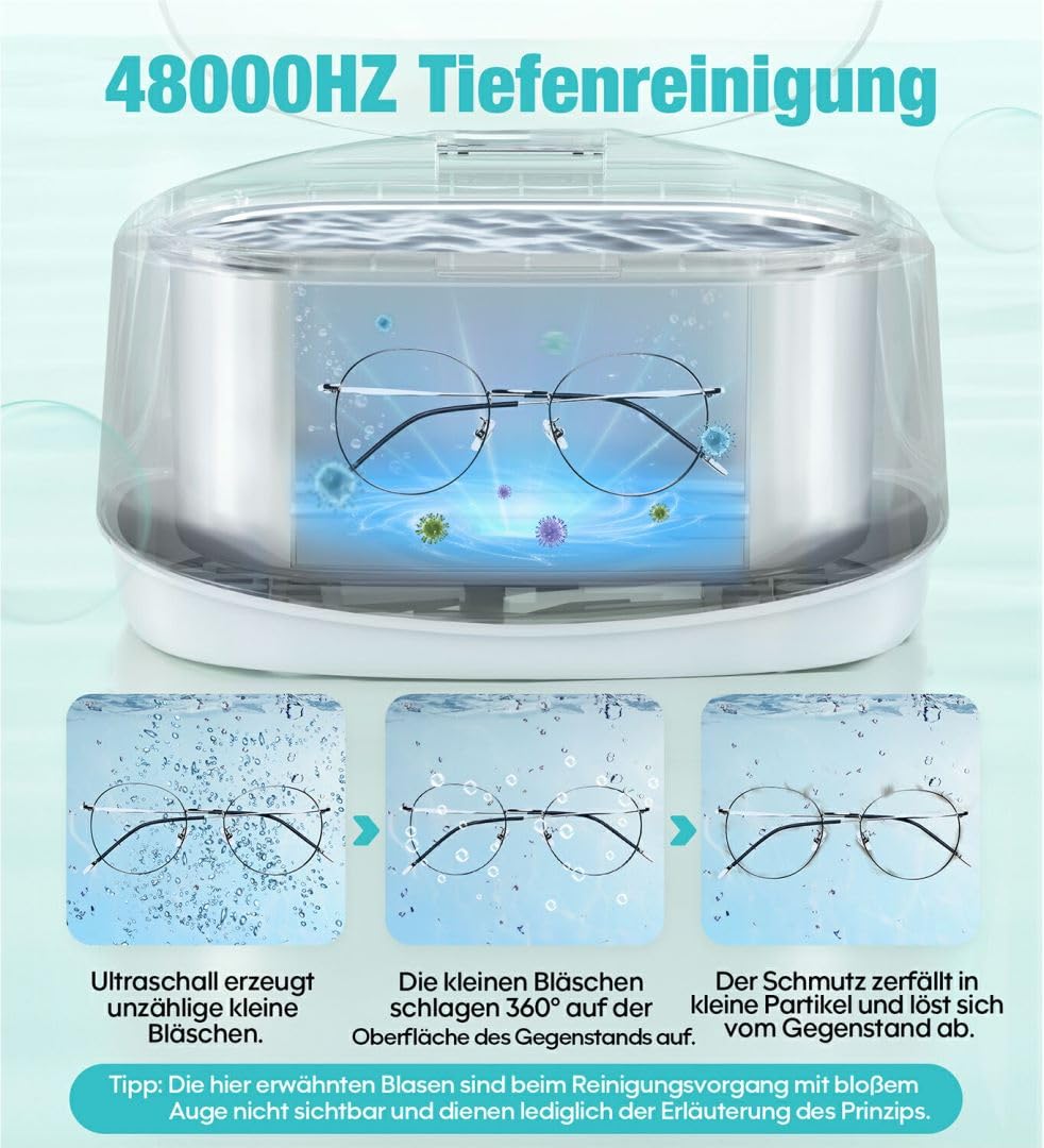 - 48 kHz augsta frekvence: ultraskaņas tīrītājs darbojas ar 48 kHz frekvenci un var veikt jaudīgu un maigu 360° dziļu tīrīšanu, radīt mikro burbuļus un spēcīgu trieciena enerģiju, lai atdalītu traipus no priekšmetiem. Atjaunojot priekšmetu spīdumu, vērtīgu priekšmetu tīrīšana ar krāna ūdeni nekaitēs un padara to par ideālu ultraskaņas tīrīšanas ierīci.