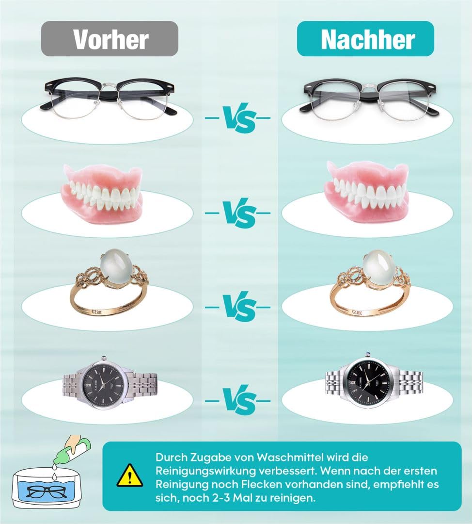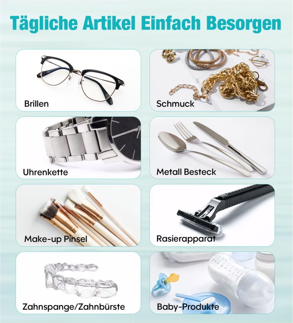 - Plašs pielietojumu klāsts: Ultraskaņas tīrītājs var tīrīt rotaslietas, pulksteņus, brilles, saulesbrilles, skuvekļu galviņas, printeru galviņas, zobu protēzes, galda piederumus, metāla monētas un daudz ko citu. (Lūdzu, ņemiet vērā: ultraskaņas tīrītājs nevar noņemt rūsu, lūdzu, nelieciet tajā sarūsējušus priekšmetus.) Mūsu ultraskaņas tīrītājs ir ideāla ierīce briļļu veikaliem, laboratorijām, juvelierizstrādājumu veikaliem, pulksteņu veikaliem, slimnīcām, birojiem un mājsaimniecībām.