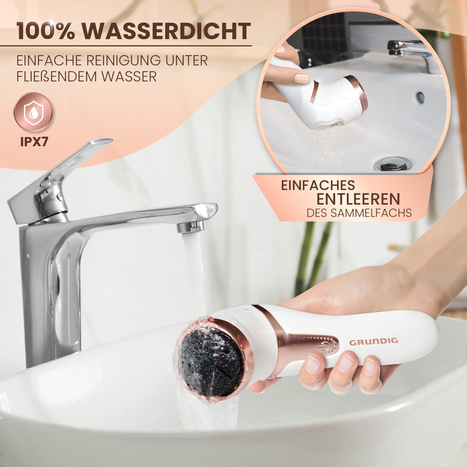 UZMANĪBU! Nekad vairs nepūtiet slīpēšanas putekļus telpā un neizplatiet irdenus slīpēšanas atlikumus apkārtējā vidē: Parastās veltņu ierīces to konstrukcijas dēļ jau tā ir vājas slīpēšanas putekļu savākšanā. Grundig tulznu noņēmējs meistarīgi atrisina šo problēmu: slīpēšanas putekļi klusi tiek savākti putekļu tvertnē. Pēc tam savākšanas nodalījumu var ātri un vienkārši izskalot zem krāna. Lūk, kā darbojas tīrība. Arī spiediena sensors un pedikīra komplekta trīsdimensiju kustības ir inovatīvas. Tas palīdz maigi un bez traumām noņemt jebkura biezuma tulznu. Ar trim slīpēšanas diskiem (smalki-vidēji-rupji) jūs turat rokās perfekti konfigurējamu pēdu kopšanas komplektu.