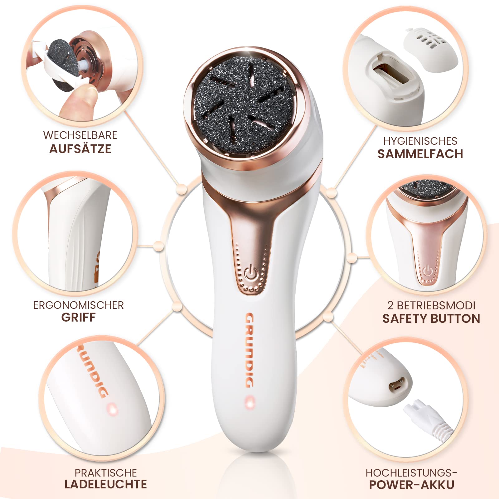 - JAUDĪGS MOTORS — Ar 2 ātruma līmeņiem un intuitīvu Grundig One Touch automātisko funkciju, kas novērš nejaušu ieslēgšanos, jūs varat optimāli rūpēties par savām pēdām. Integrētais spiediena sensors pielāgo trīsdimensiju kustību un nodrošina saudzīgu tulznu noņemšanu. 3 maināmi un atkārtoti pasūtāmi slīpēšanas diski – smalki, vidēji un rupji – lieliski pārklāj visdažādākos sacietējumu biezumus, nodrošinot saudzīgu noņemšanu.