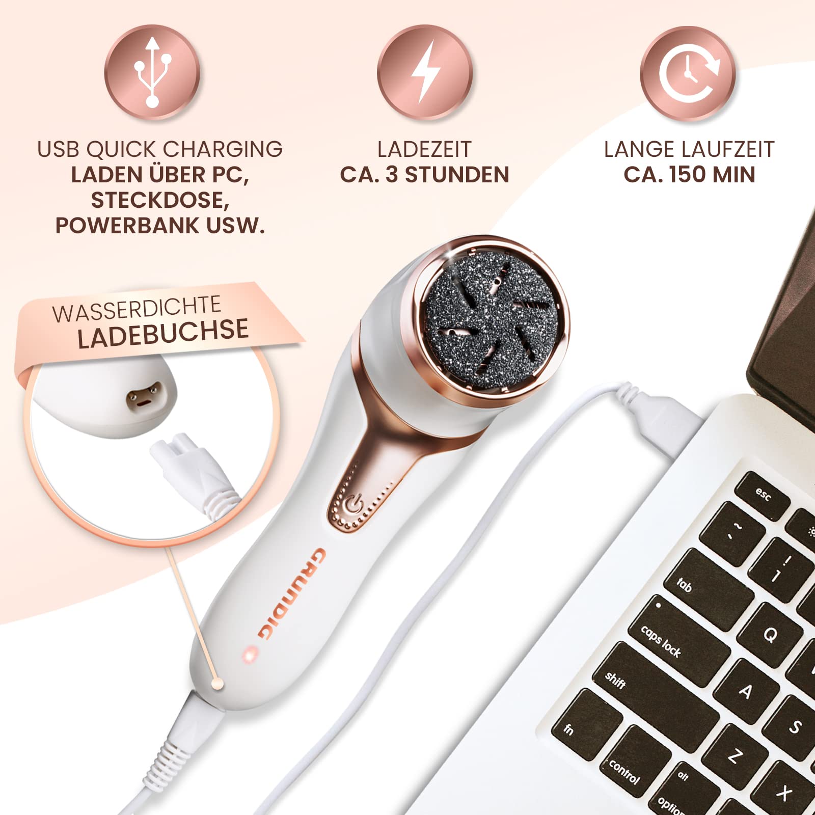 - Tehniskās specifikācijas - uzlādes spriegums 5 V līdzstrāva ar apm. 2 stundu uzlādes laiks, pēdu kopšanas ierīci var izmantot uzlādes laikā, jaudīgs motors ar 3 vatu jaudu, litija polimēru augstas veiktspējas akumulators ar 2000 mAh, 3 maināmi un atkārtoti pasūtāmi slīpripas (smalka, vidēja, rupja), iekļauts USB uzlādes kabelis