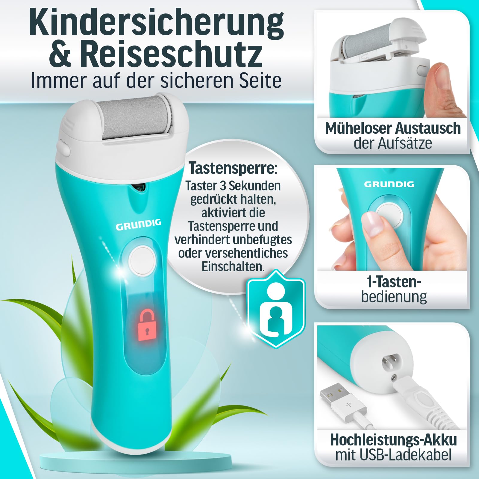 - PIEGĀDES KOMPLEKTS: 1x mūsu jaudīgākais Grundig Callus Remover Pro ar 3 īpašiem rullīšiem: maigs, spēcīgs, ļoti spēcīgs. 1 x tīrīšanas birste, 1 x uzlādes kabelis savienošanai ar USB lādētājiem, daudzvalodu lietotāja rokasgrāmata