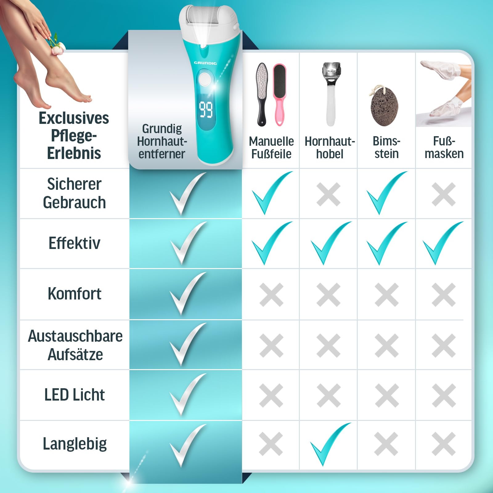 Grundig Pro modelis apvieno augstus kvalitātes standartus ar inovācijām, piemēram, spilgtu LED darba apgaismojumu, lai viegli novērtētu sacietējuma biezumu noņemšanas laikā, un ūdens izturību. kas arī nodrošina ātru tīrīšanu pēc lietošanas.