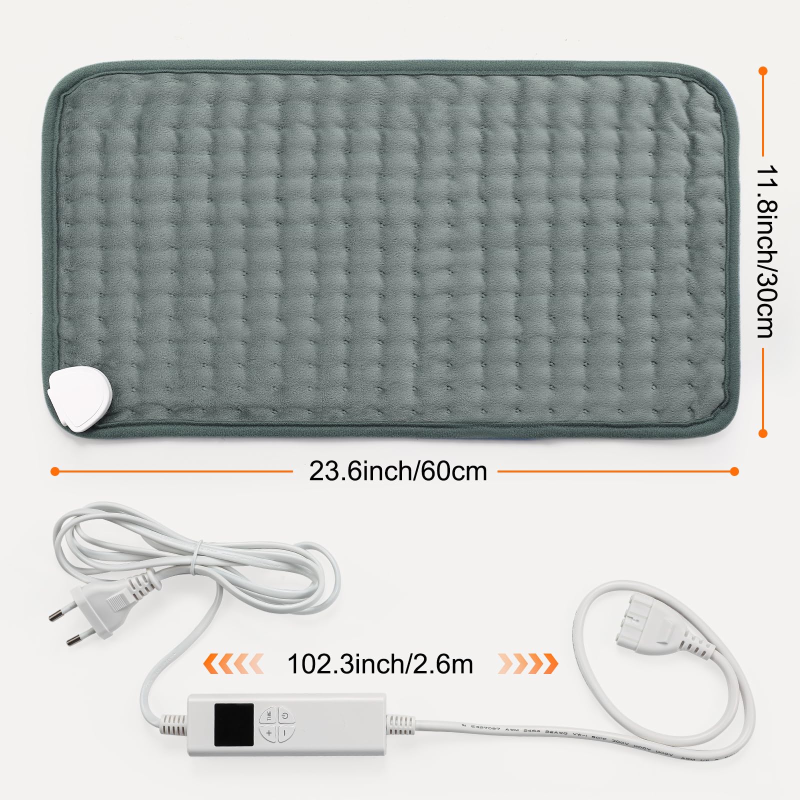 - TEMPERATŪRAS UN LAIKA IESTATĪJUMS: Bezvadu sildīšanas paliktnim ir 6 līmeņu temperatūras iestatījums. Elektriskā sildīšanas paliktņa temperatūras diapazons: 40°C–65°C (104°F–149°F), ātra uzsilšana, lai apmierinātu dažādas sildīšanas vajadzības; 4 pakāpju taimera iestatījums (1H/2H/4H/6H), inteliģenta temperatūras kontrole, lai novērstu pārkaršanu, vairāk nekā 60 grādiem, sildīšanas spilventiņš automātiski pārslēgsies uz 2 pakāpēm. Sildīšanas sega ir aprīkota ar vadības paneli ērtai lietošanai.
