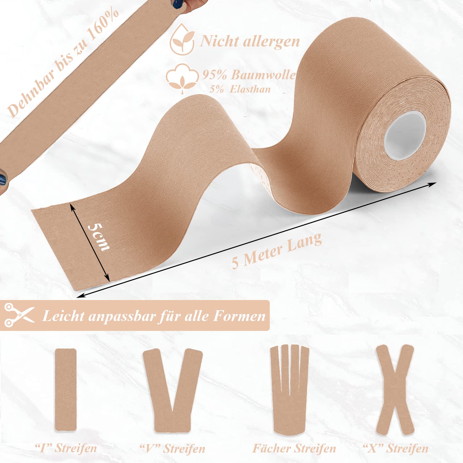 • 【Augsta kvalitāte】 Lentes sports ir izgatavots no 95% kokvilnas un 5% elastīgām šķiedrām, tas ir ādai draudzīgs un neizraisa alerģiju. Fizioteipa ir ļoti elastīga un to var izstiept līdz 160% no sākotnējā garuma, nezaudējot elastību. Ar dažādu stiepšanās pakāpi sporta teips atbalsta ievainotos muskuļus un locītavas un nodrošina drošu un nesāpīgu kustību diapazonu.