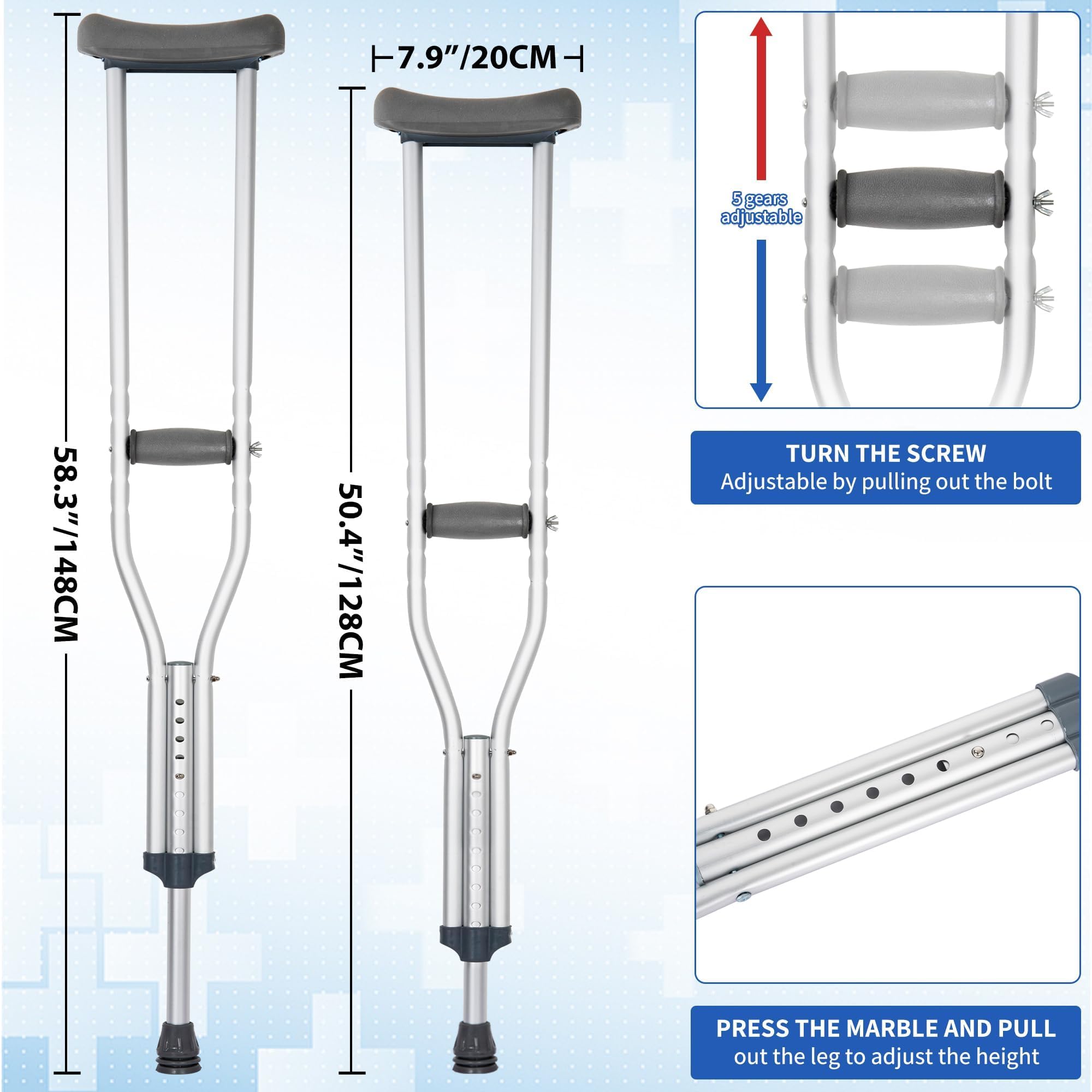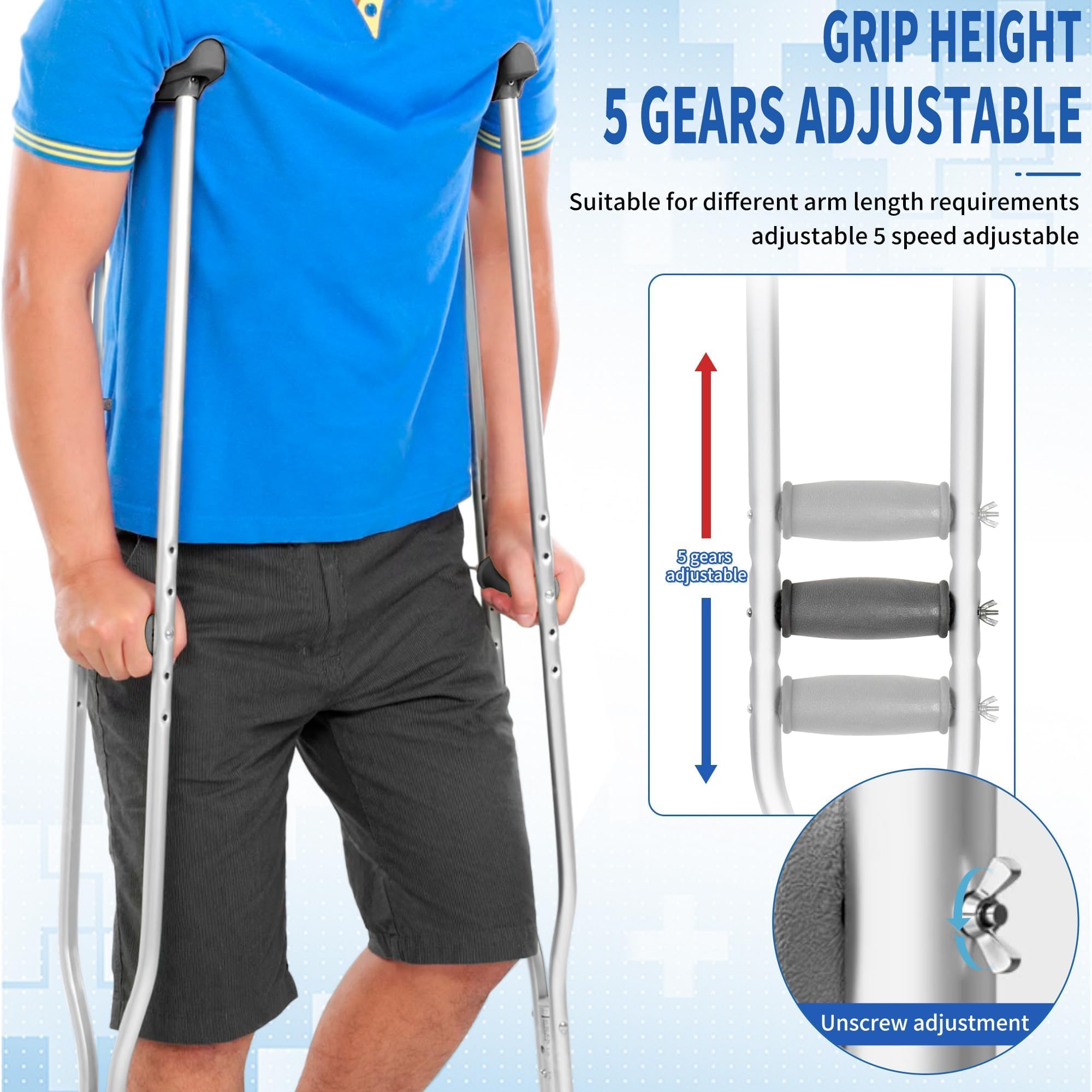 - AUGSTUMU REGULĒJAMS: Kruķi ir paredzēti cilvēkiem augumā no 175 cm līdz 195 cm, lai palīdzētu potīšu, ceļgalu un kāju traumu gadījumā un ļautu staigāt ar mazāku slodzi uz ievainoto ķermeņa daļu. Augstuma regulēšana ar vienu pogu ļauj viegli pielāgot augstumu no 128 cm līdz 148 cm ar 9 iestatījumiem.