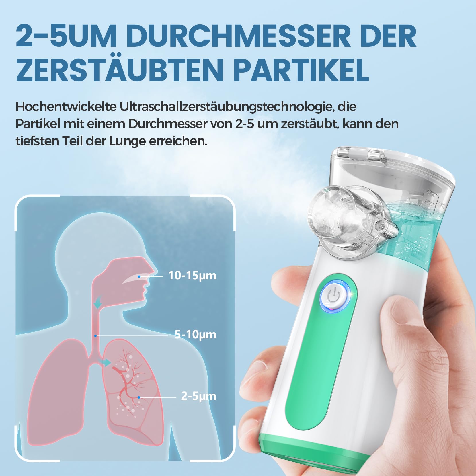 - ✅Ultraskaņas inhalatora sieta smidzinātājs: Pateicoties sīkām ultraskaņas vibrācijām un smidzināšanas galviņai ar īpaši smalku sietu, bērniem paredzētais inhalators rada daļiņas ar vidējo diametru 3 mikrometri vai mazāk, kas var iekļūt terminālajos bronhos un alveolās, lai uzlabotu efektivitāti. Inhalācijas ierīce Baby apvieno kompresijas smidzinātāju un ultraskaņas smidzinātāju priekšrocības, lai nodrošinātu maigāku smidzināšanu un pasargātu bērnus no klepus.