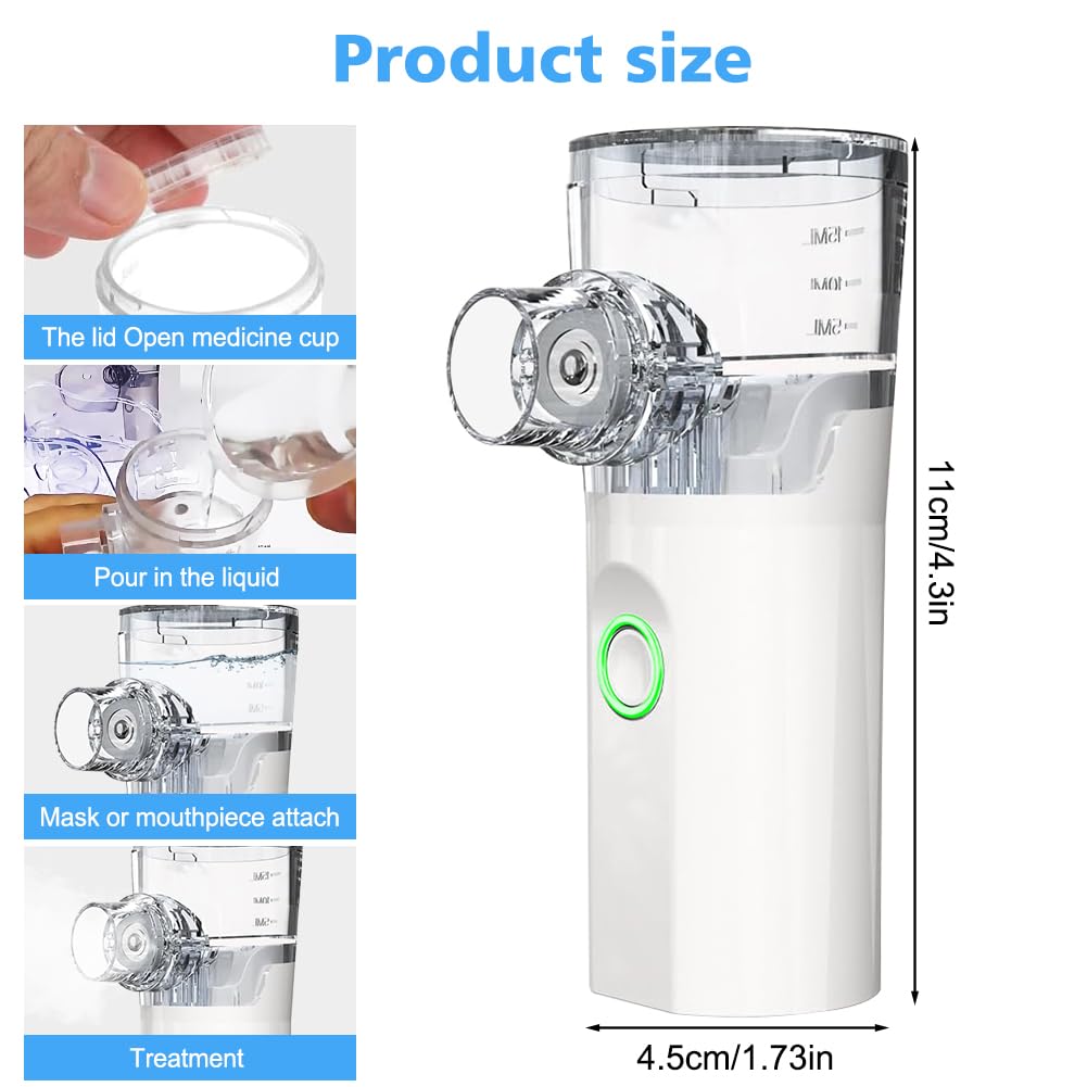 - 【PIEMĒROTS VISIEM VECUMIEM】Atomizators ir aprīkots ar pieaugušo masku, bērnu masku un iemutni. Tas ir piemērots visām vecuma grupām. Ļoti maza un smalka rokas ierīce, ko var viegli ielikt kabatā. Jūs to varat izmantot jebkurā laikā un vietā.