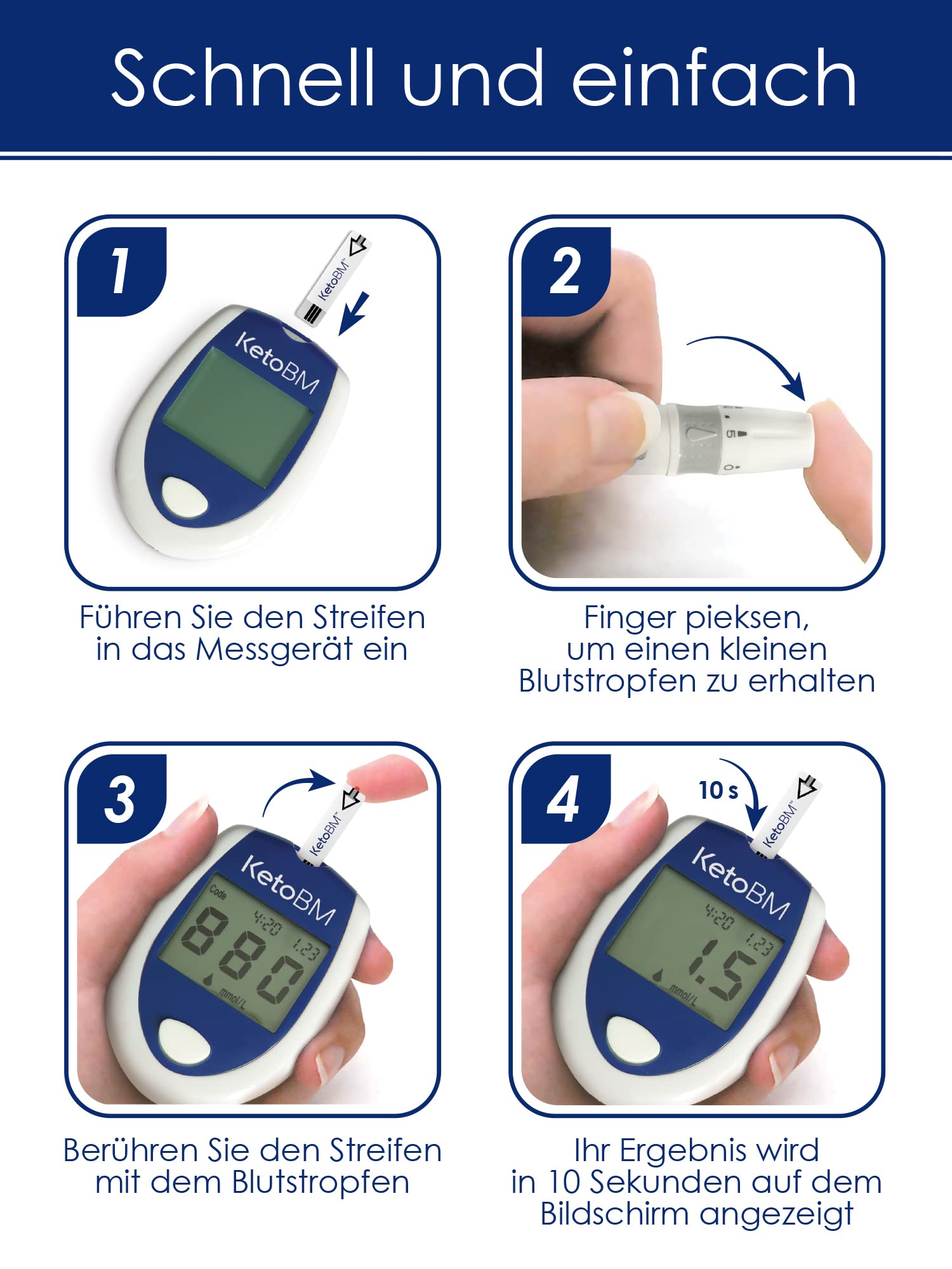 - IZBAUDI TESTĒŠANU BEZ SĀPĒM: Atvadies no diskomforta un izbaudi testēšanu bez raizēm! Ar KetoBM asins ketonu mērītāju jūs gandrīz neko nejutīsiet. Nepieciešams tikai neliels asins paraugs no pirksta – 0,5 mmol/l. Parauga lieluma samazināšana ļauj izvairīties no kļūdām un testa strēmeļu izšķērdēšanas nepietiekama paraugu skaita dēļ. Izbaudiet nevainojamu testēšanu, neapdraudot precizitāti.