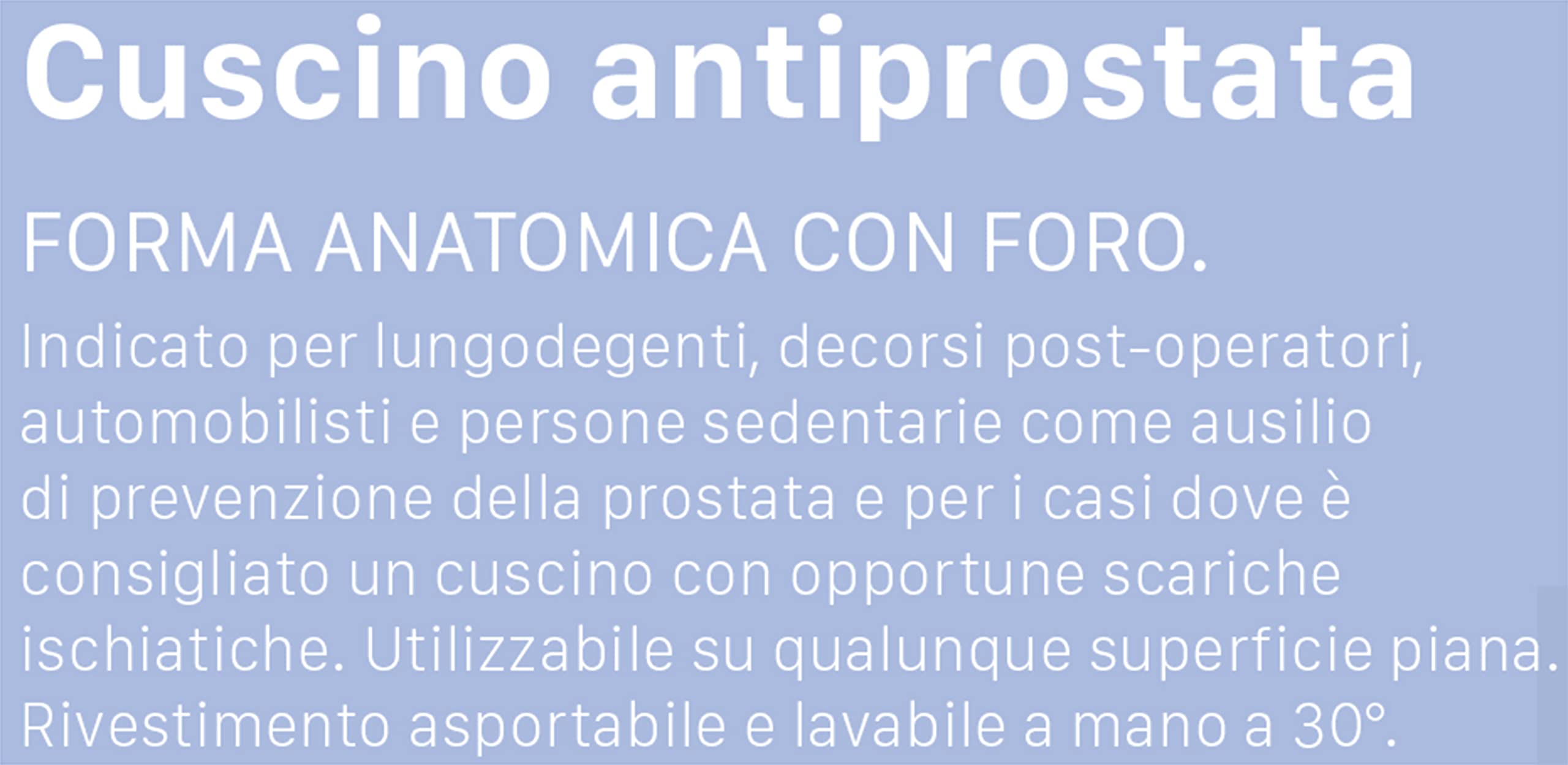- Piemērots ilgstošai un pēcoperācijas ārstēšanai. Ideāli piemērots autovadītājiem un cilvēkiem ar mazkustīgu dzīvesveidu, lai novērstu prostatas problēmas, kā arī gadījumos, kad ieteicams spilvens ar atbilstošu sēžas muskuļu atvieglojumu. Anatomiska forma ar caurumu. Var izmantot uz jebkuras līdzenas virsmas. Pārvalks mazgājams 30° temperatūrā, mazgājams ar rokām
