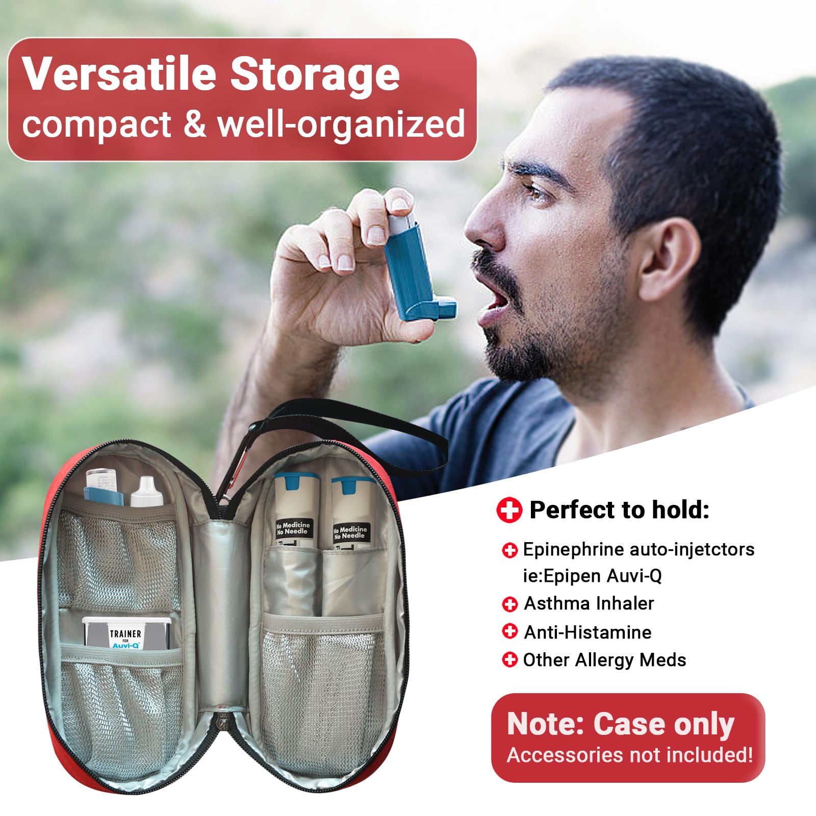 - Pārdomāta un praktiska organizācija: Ārējie izmēri: 21 x 9 x 6,5 cm (garums x platums x augstums). Aprīkots ar vairākiem nodalījumiem alerģijas/astmas neatliekamās palīdzības piederumu, piemēram, 2 EpiPen, adrenalīna autoinjektora, astmas inhalatoru, antihistamīnu, Auvi-Q, pirmās palīdzības piederumu un citu svarīgu alerģijas medikamentu, drošai glabāšanai. Nodrošina, ka jūsu avārijas aprīkojums ir skaidri sakārtots un nekavējoties pieejams ārkārtas situācijā.