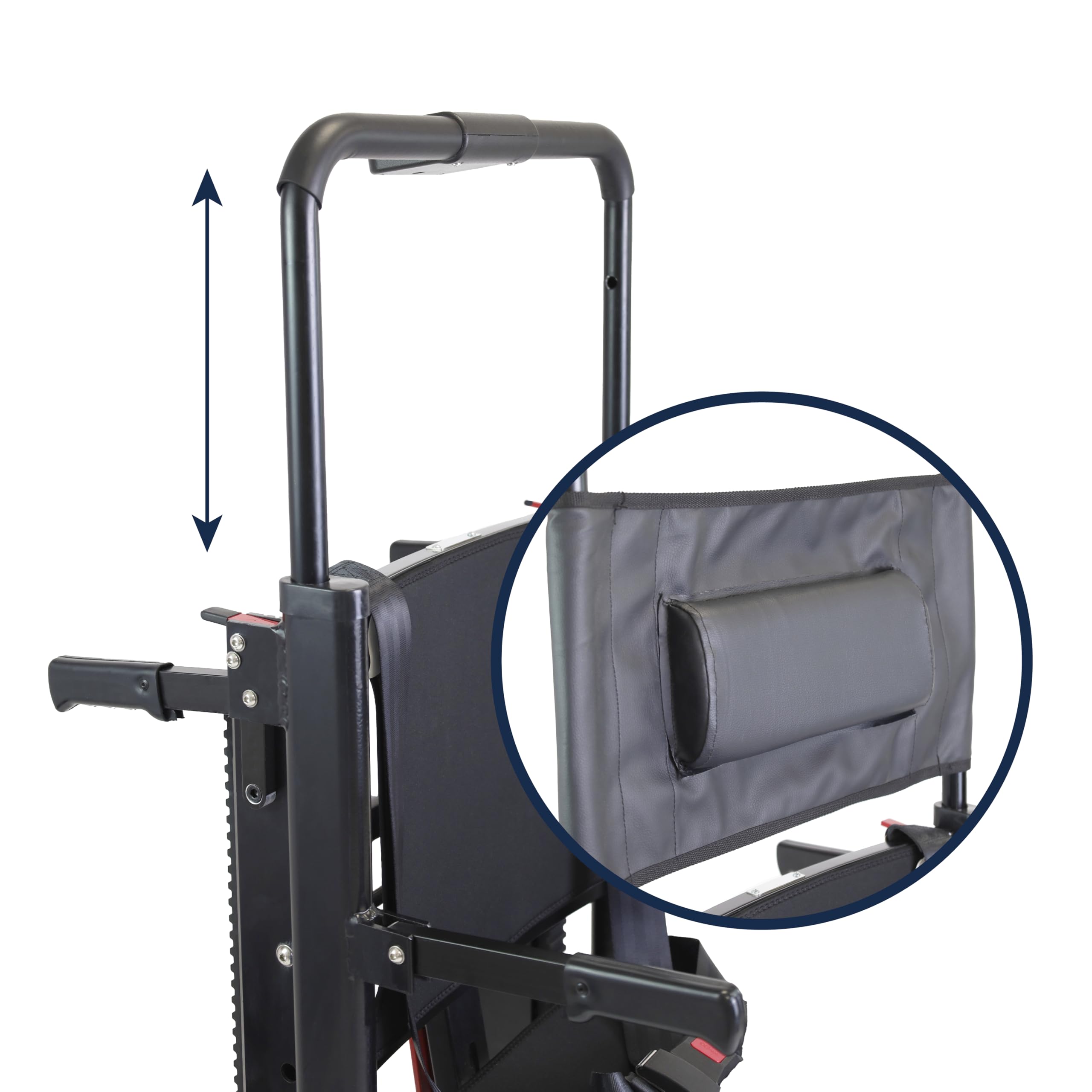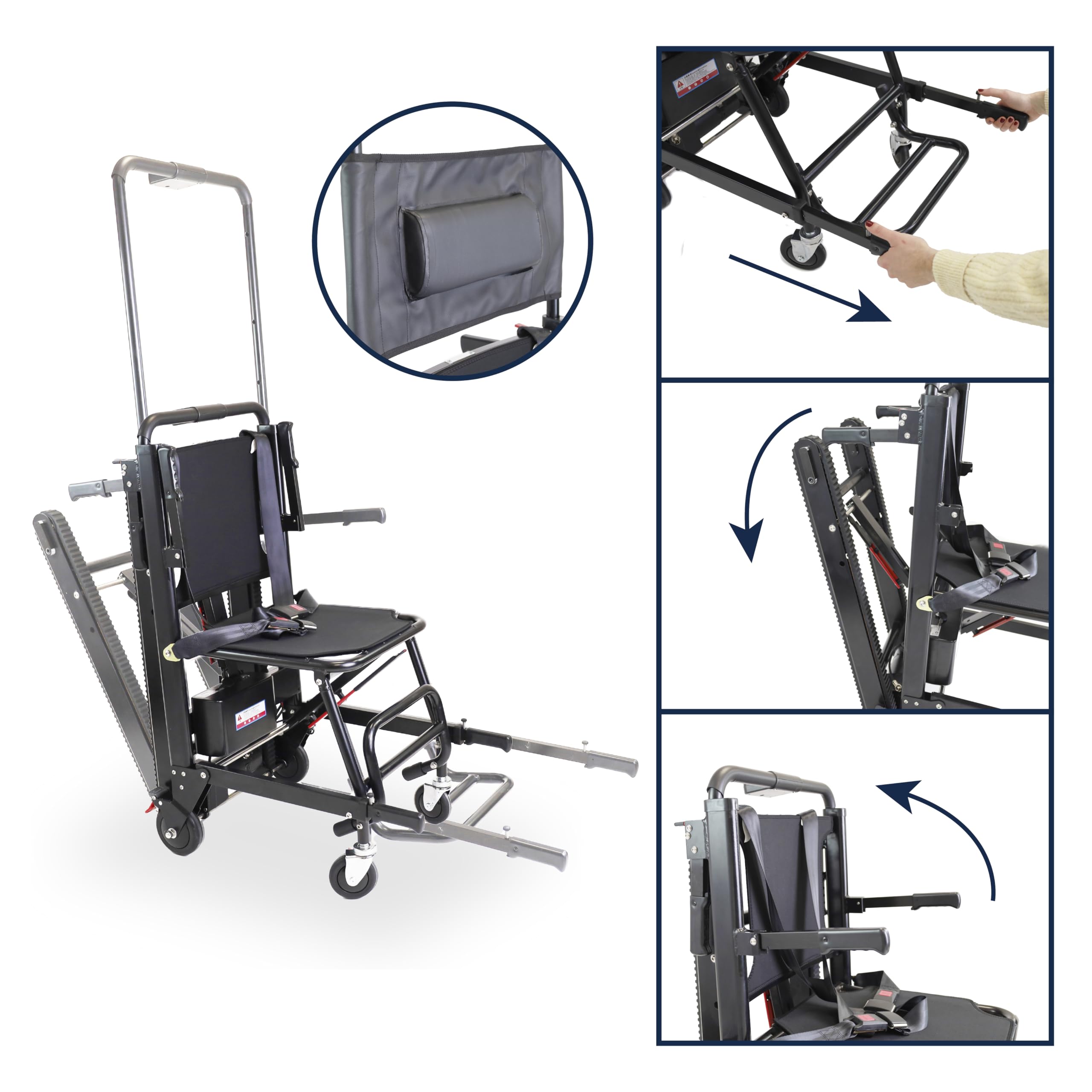 - DROŠS UN DAUDZPUSĪGS: Kāpņu kāpējam ir drošības josta, aizmugurējo riteņu bremzes un regulējami kāju balsti, lai nodrošinātu lietotāja drošību. To var izmantot arī manuāli, kad akumulators ir izlādējies, padarot šo elektrisko kāpņu kāpēju par uzticamu risinājumu jebkurā situācijā.