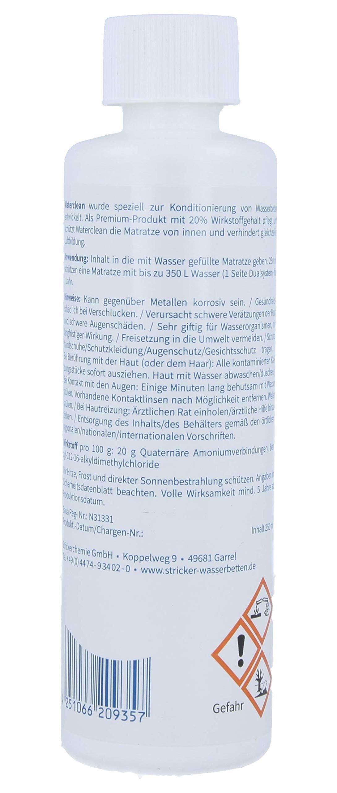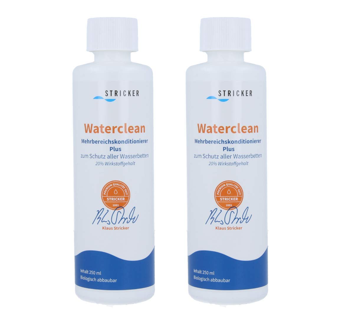 2 x 250 ml daudzfunkcionāls kondicionieris PLUS, lai apkarotu mikroorganismus un novērstu smakas un pūslīšu veidošanos ūdensgultu serdēs. Waterclean daudzzonu kondicionieris PLUS ir efektīvs pret baktērijām, sēnītēm, raugiem un aļģēm. Aktīvās vielas var ātri izvadīt bioloģiskajās notekūdeņu attīrīšanas iekārtās, un atšķaidītā veidā tām nav negatīvas ietekmes uz notekūdeņu attīrīšanas iekārtu bioloģiju. Kā specializēts mazumtirgotājs mēs saprotam veselīga miega nozīmi, kas būtiski veicina mūsu labsajūtu. Mūsu produktus raksturo izturība un izsmalcinātas tehnoloģijas — vairāk relaksācijas caur miegu? Mēs nevaram ietekmēt miega ilgumu. Bet miega kvalitāte. Lai to panāktu, mūsu piegādātāji izmanto augstas kvalitātes izejvielas, labāko apstrādi, pētniecību un attīstību. Produktiem, kas ir unikāli pasaules tirgū. Lai miega laikā jūs gūtu maksimālu labsajūtu, sniegumu un veselību. 2 pudeles pa 250 ml katra! Pēc ūdensgultas piepildīšanas iesakām to izvēdināt, lai gaiss varētu izplūst.