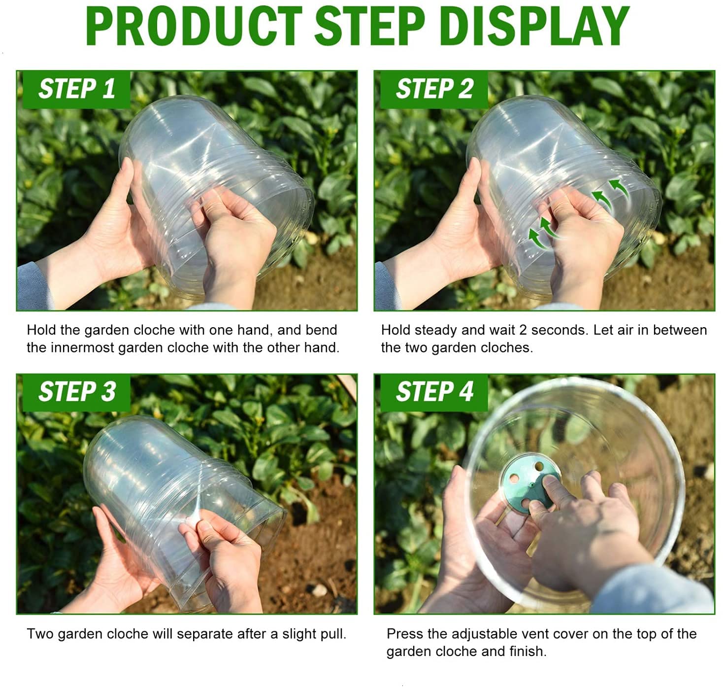- [Viegli lietojams] Vienkārši pārklājiet augu ar dārza kupola zvaniņa pārsegu, pēc tam ievietojiet fiksācijas tapas caur pārsega caurumu un visbeidzot atveriet vai aizveriet ventilācijas atveri (vadiet melno ventilācijas plāksni augšpusē), neuztraucieties par to, ka vējš aizpūš segas.