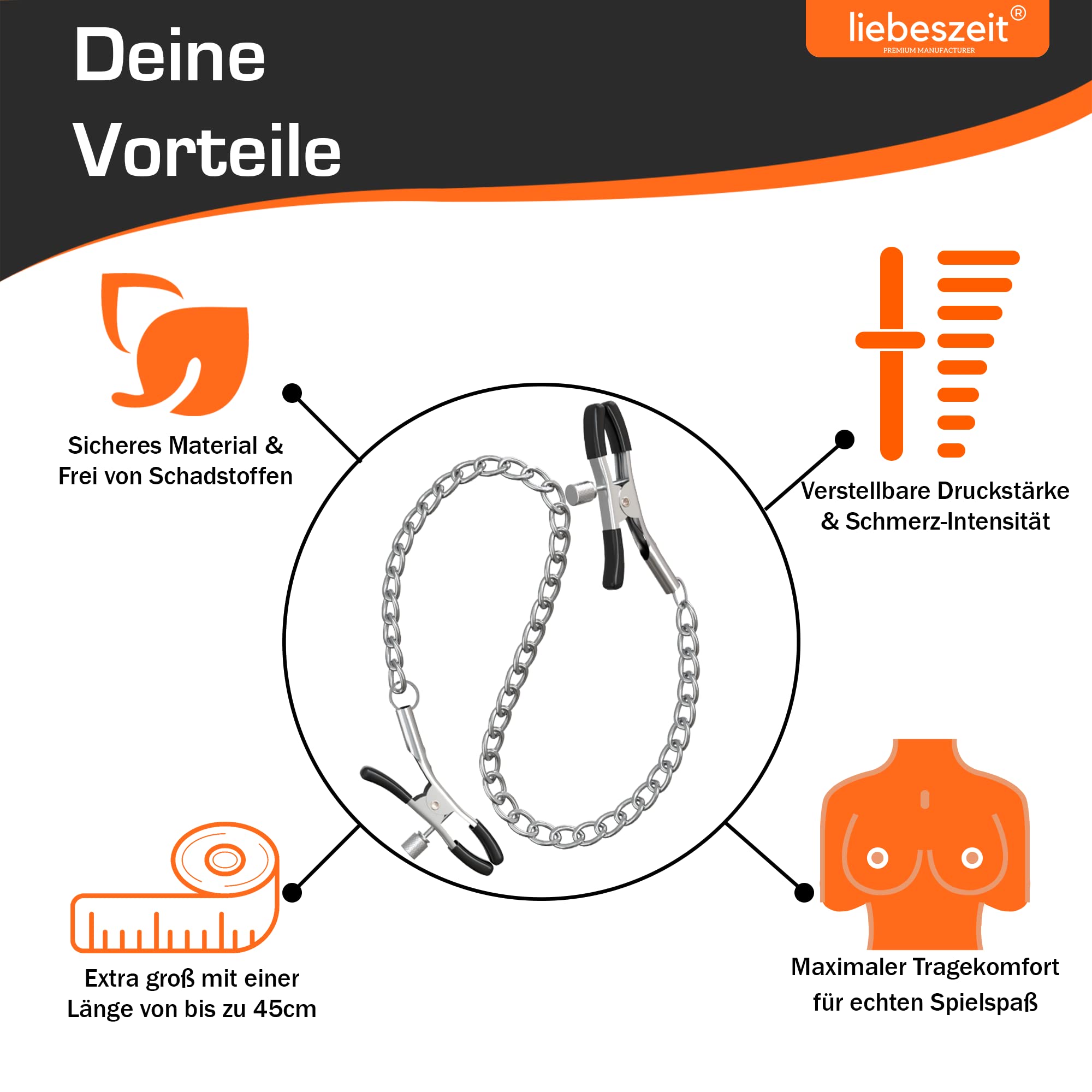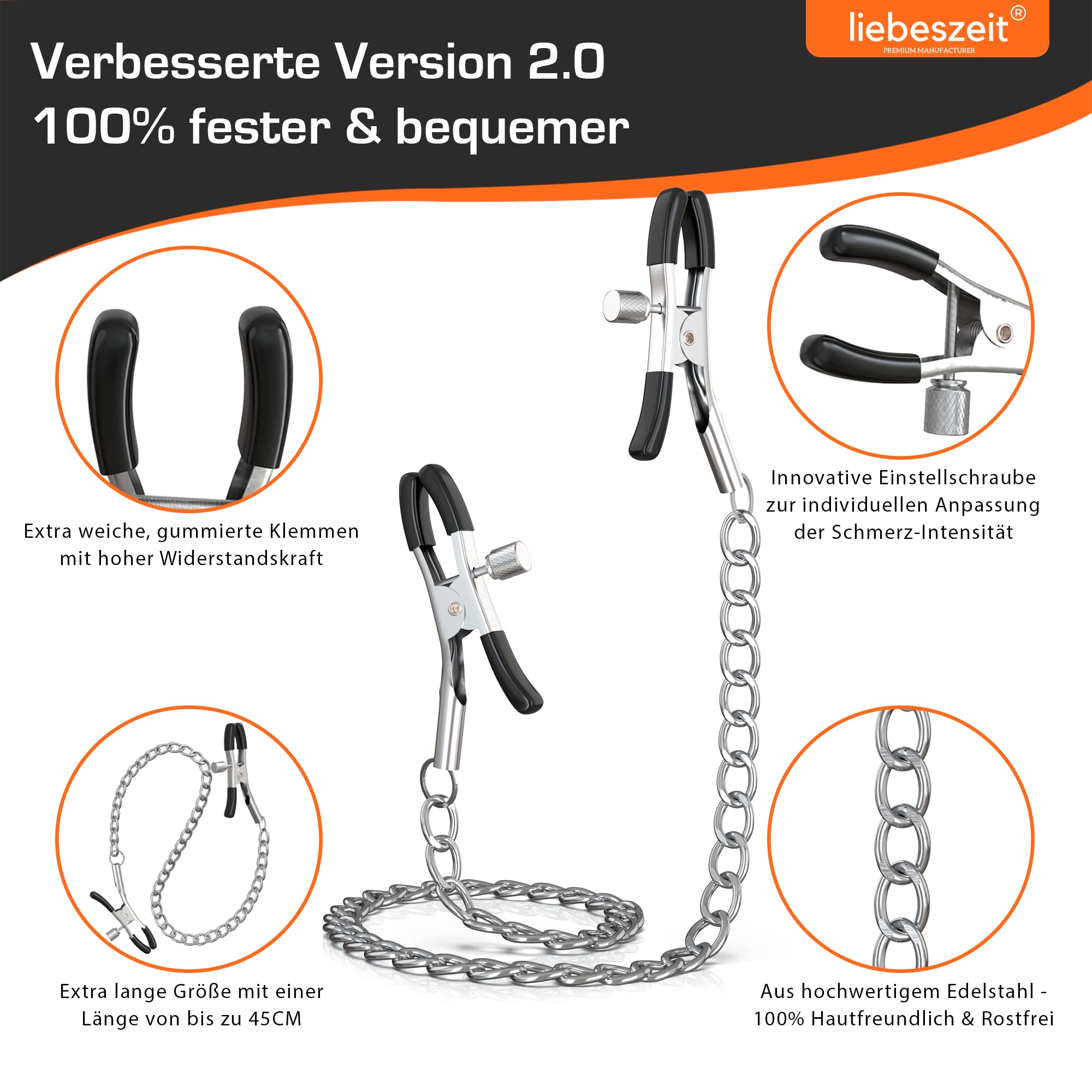 • 🌈 MAKSIMĀLA STIMULĀCIJA - Uzlabotā LIEBESZEIT populāro krūtsgala skavu versija nodrošina neaizmirstamu erotisku piedzīvojumu pāriem un ir neaizstājama kā BDSM seksa rotaļlieta verdzībai! Izbaudiet intensīvu krūtsgala stimulāciju un sāpju stimulus ar papildu gumijotām, mīkstām skavām - maksimālai jautrībai visaugstākajā kvalitātes līmenī!